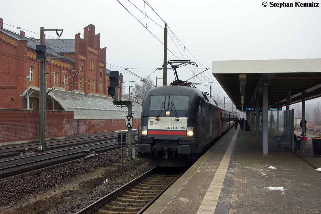 ES 64 U2 - 097 (182 597-5) MRCE Dispolok GmbH für ODEG - Ostdeutsche Eisenbahn GmbH mit dem RE4 (RE 37313) von Rathenow nach Ludwigsfelde in Rathenow. Vorne befand sich die ES 64 U2 - 002 (182 502-5). 20.12.2012 Stephan Kemnitz