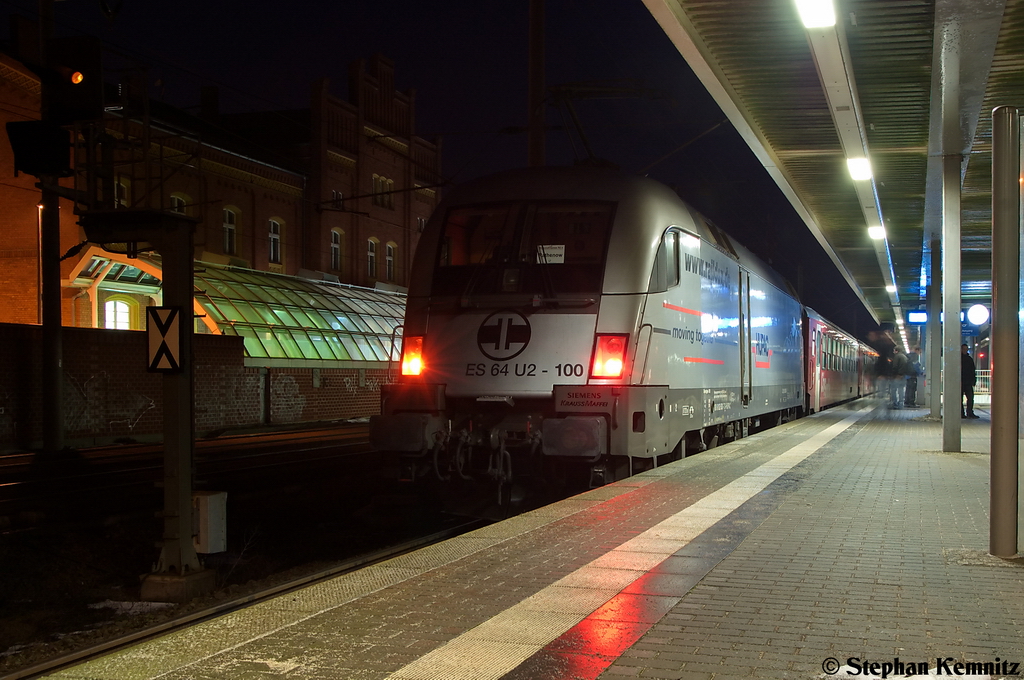 ES 64 U2 - 002 (182 502-5) MRCE Dispolok GmbH für ODEG - Ostdeutsche Eisenbahn GmbH mit dem RE4 (RE 37321) von Rathenow nach Jüterbog in Rathenow. 10.12.2012 Stephan Kemnitz
