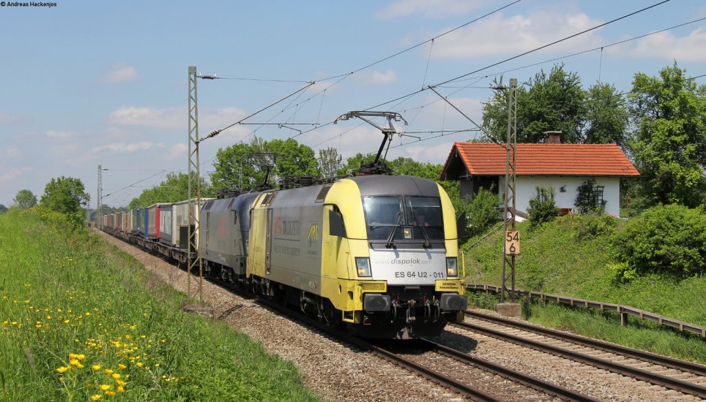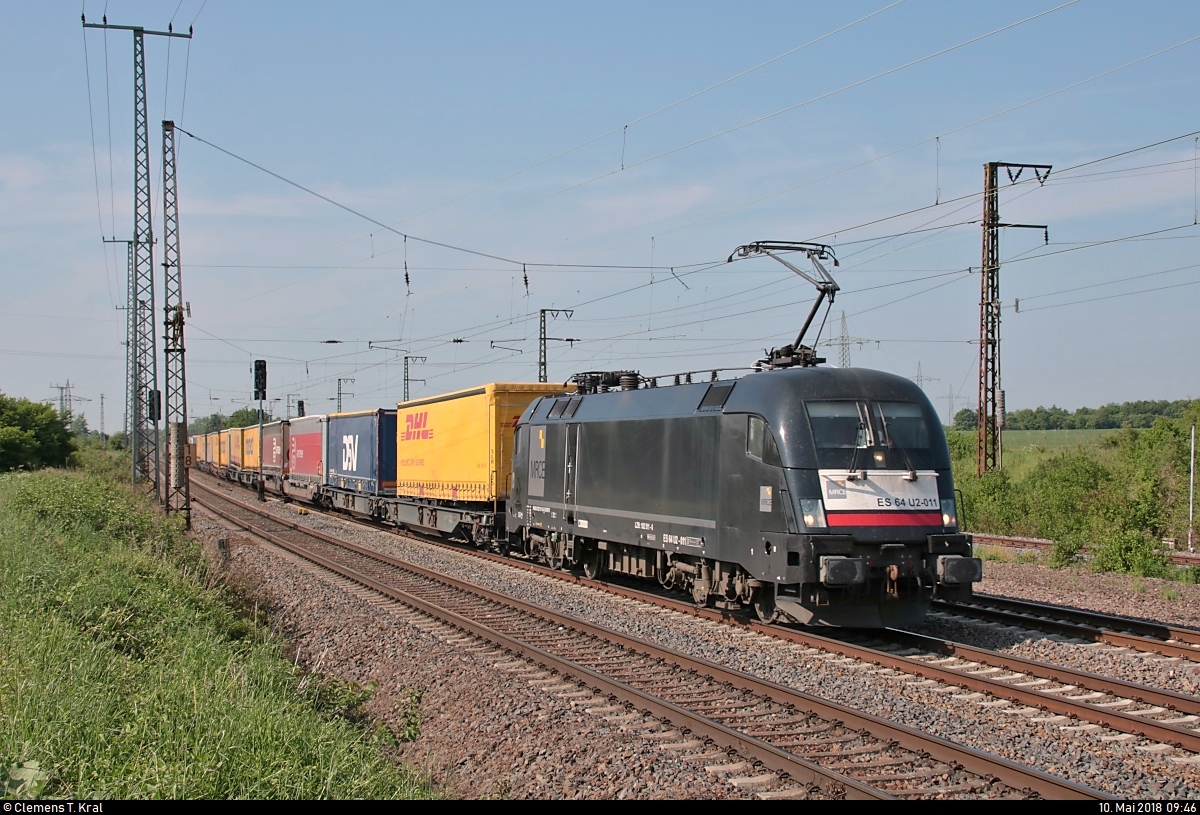 KLV-Zug mit 182 511-6 MRCE (Siemens ES64U2-011) fährt in Großkorbetha auf der Bahnstrecke Halle–Bebra (KBS 580) Richtung Bahnhof Großkorbetha.