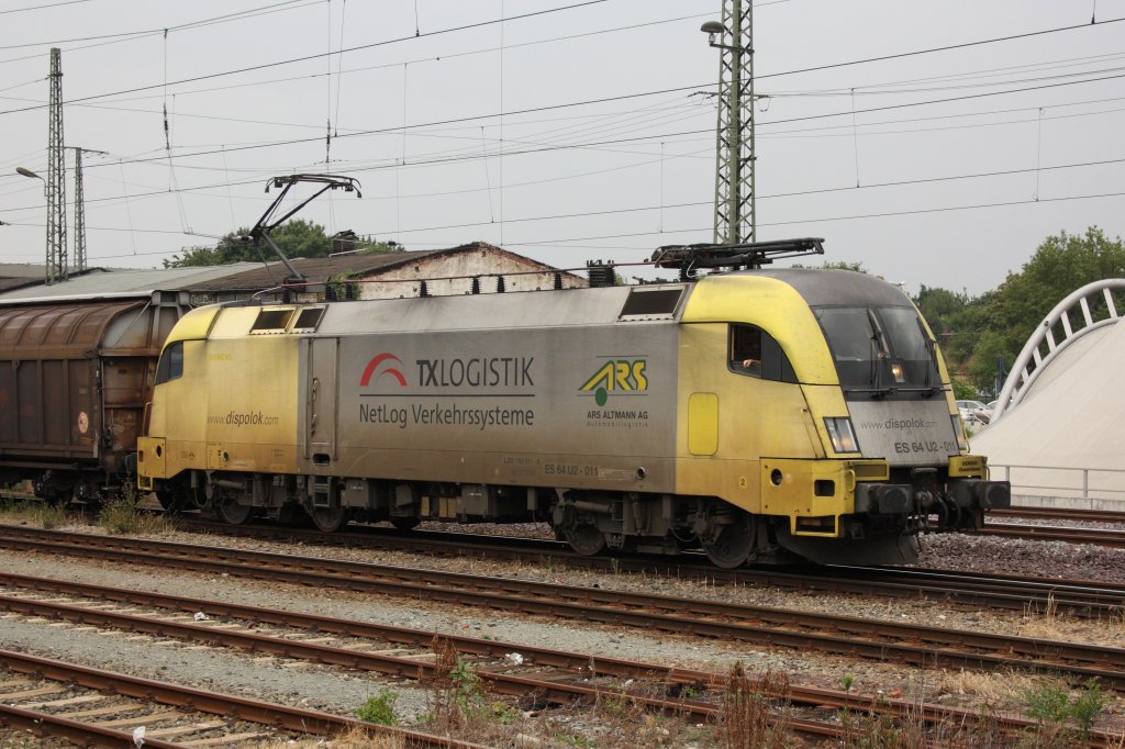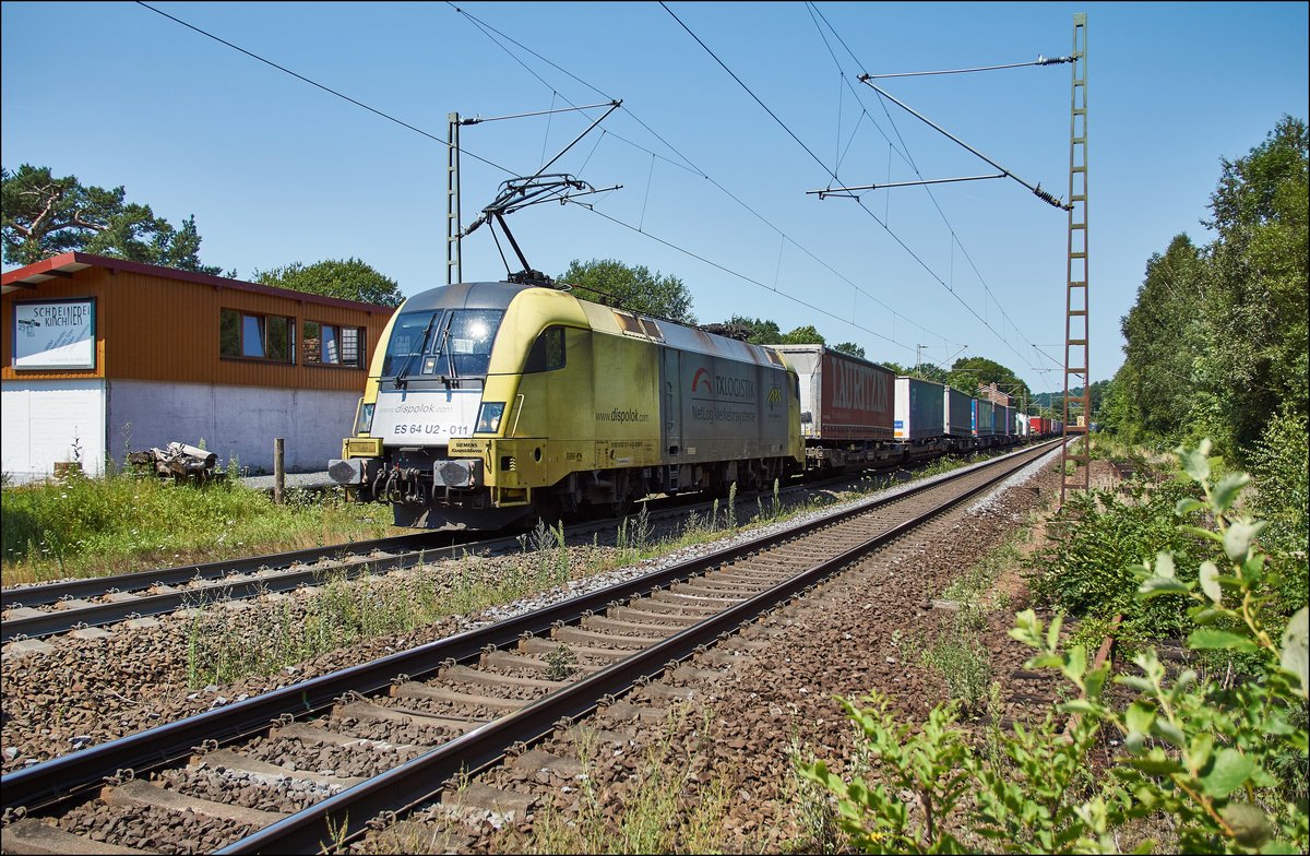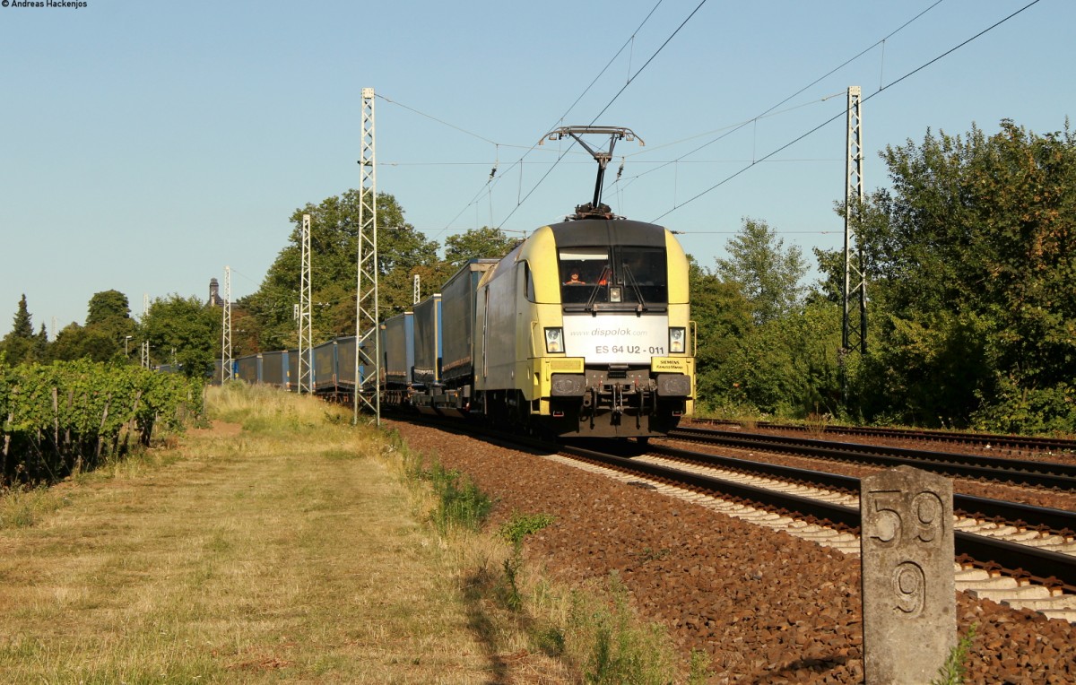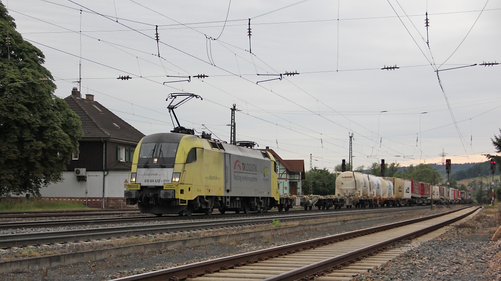 ES 64 U2-011 (182 511-6) von TXLOGISTIK ist am 19.07.2017 mit einen Aufliegerzug bei Vollmerz zu sehen.Bild wurde von öffentlichen Gelände gemacht. Mathias Starke
