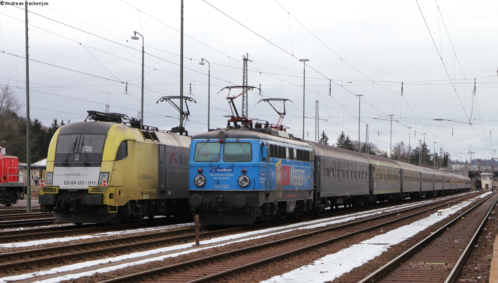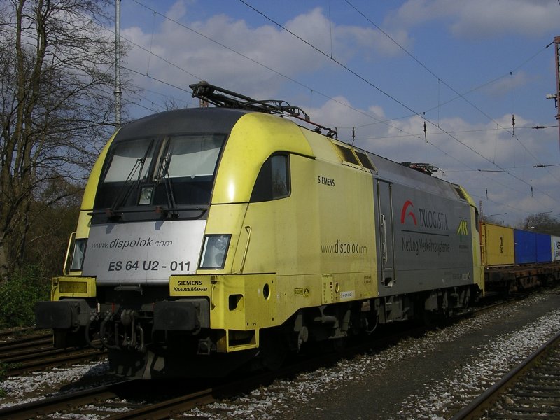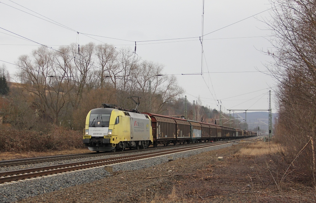 Am 21.02.2012 war 182 511-6 (ES 64 U2-011) mit einem H-Wagen Ganzzug in Richtung Süden unterwegs. Aufgenommen am BÜ Eltmannshausen/Oberhone. Jens Baumhauer