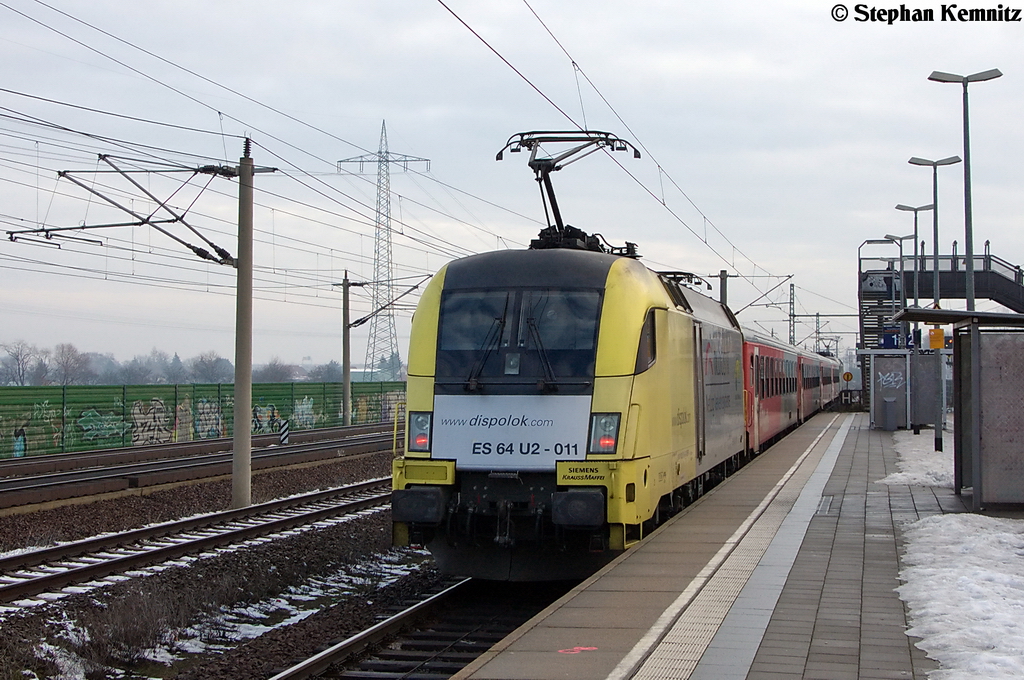ES 64 U2 - 011 (182 511-6) MRCE Dispolok GmbH für ODEG - Ostdeutsche Eisenbahn GmbH mit dem RE4 (RE 37313) von Rathenow nach Ludwigsfelde, bei der Ausfahrt in Wustermark. 17.12.2012 Stephan Kemnitz