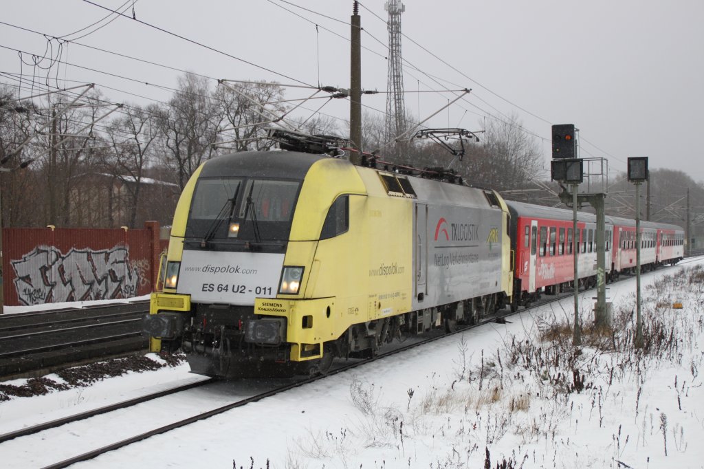 ES 64 U2 - 011 (182 511-6) MRCE Dispolok GmbH für ODEG - Ostdeutsche Eisenbahn GmbH mit dem RE4 (RE 37310) von Ludwigsfelde nach Rathenow, bei der Einfahrt in Rathenow. 09.12.2012 Stephan Kemnitz