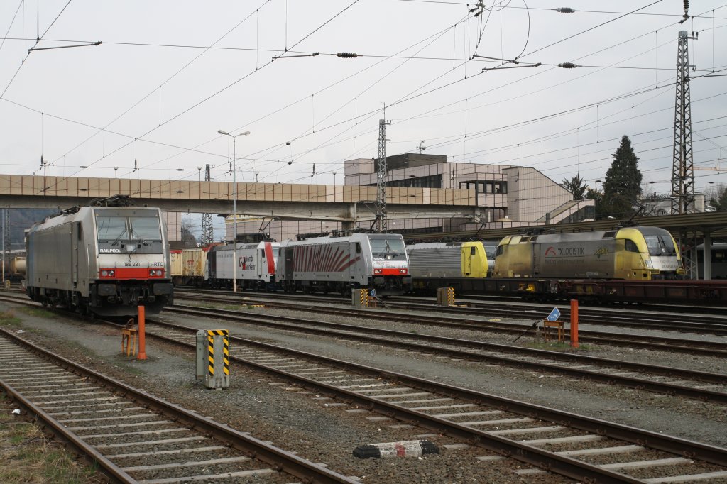 Viel los in Kufstein. Am 27.3.2011 am frühen Nachmittag war reger güterverkehr nach Italien zu sehen. 186 284-6, 185 665-7 und 182 511-6, 189 923-6 warten jeweils auf die Ausfahrt Richtung Brenner und 186 281-2 (noch mit alter Lackierung)wartet derweil noch auf ihren Einsatz. Julien Seeling