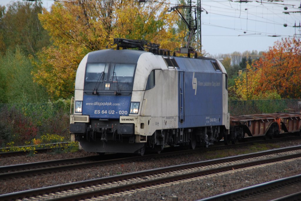 Eine erstmalige Sichtung: Taurus 182 520-7 (ES64U2-020) der Wiener-Lokalbahnen bringt am Nachmittag des 26.10.2012 einen Zug leerer Containerwagen in den Güterumschlagbahnhof Hamm/Westfalen. (Geschossen mit meiner Kamera, aber von meiner Frau Verena).