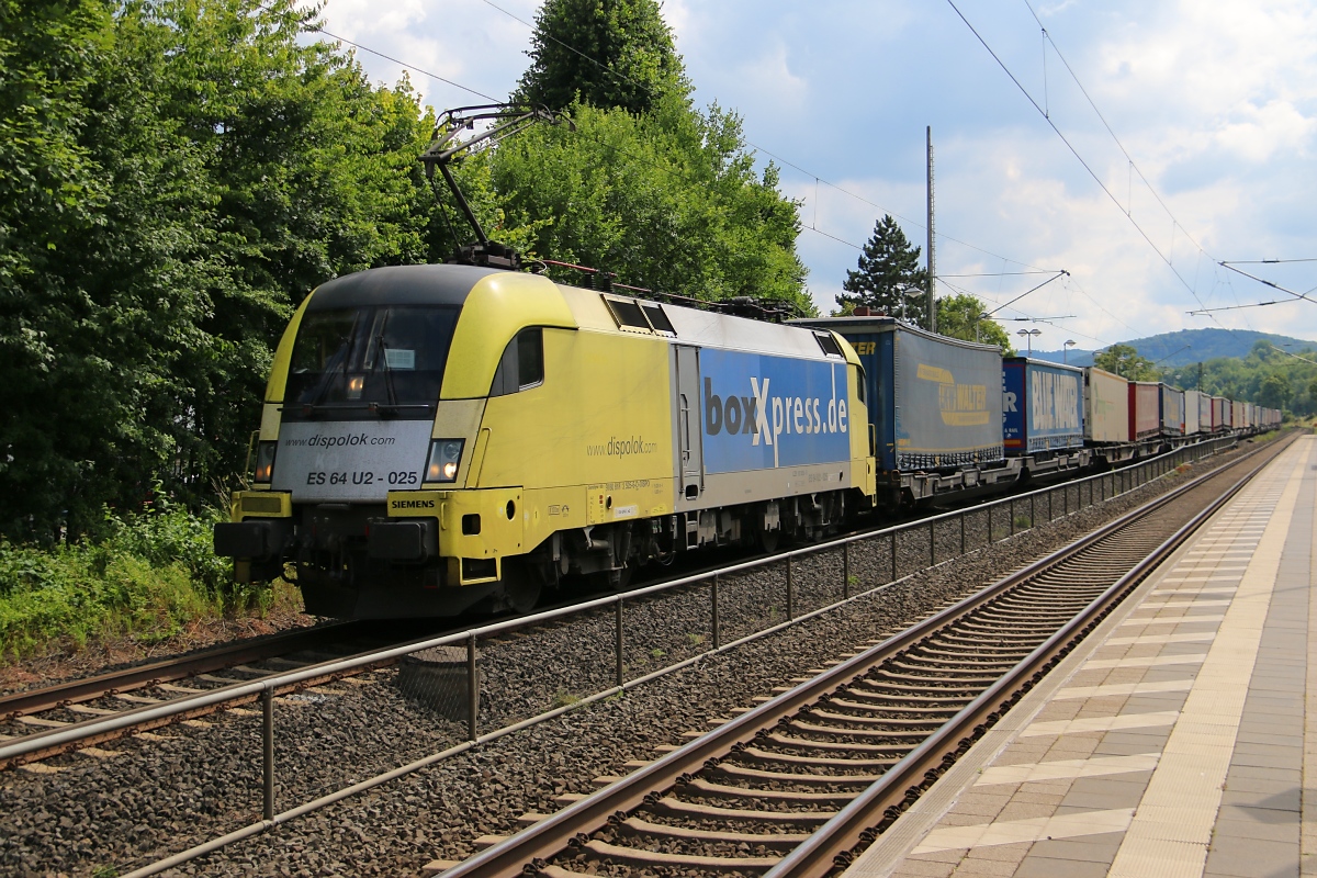 182 525-6 (ES 64 U2-025) mit Containerzug in Fahrtrichtung Norden. Aufgenommen am 26.06.2014 in Wehretal-Reichensachsen.