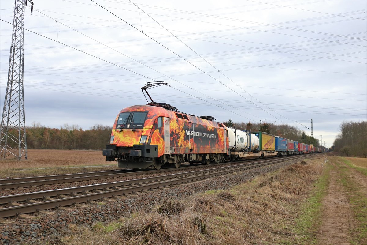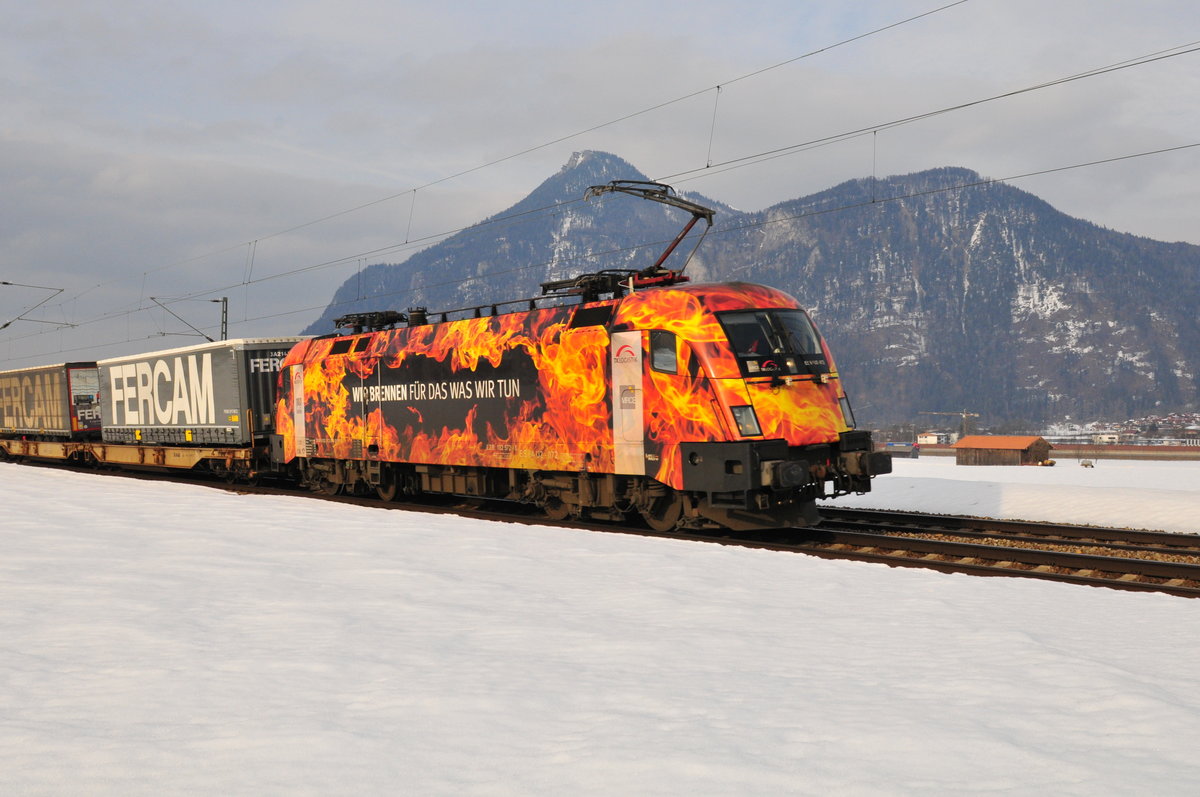 Die TX Logistik Siemens 182 572-8 "Wir brennen für das was wir tun" mit einem Taschenwagen-Zug am 21.02.19 bei Oberaudorf in Richtung Kufstein. Mario Buchner