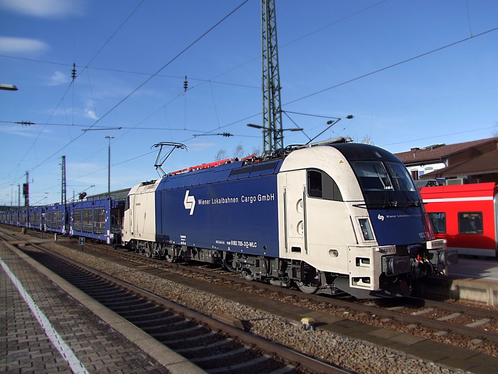 Wiener Lokalbahnen Cargo GmbH 183 705-3 vor Ganzzug Container, KBS 880 Nürnberg - Passau, fotografiert auf der Isarbrücke in Plattling am 16.01.2012 --> im Hintergrund ist die Abdampffahne der Zuckerfabrik Plattling zu sehen Frank Grohe