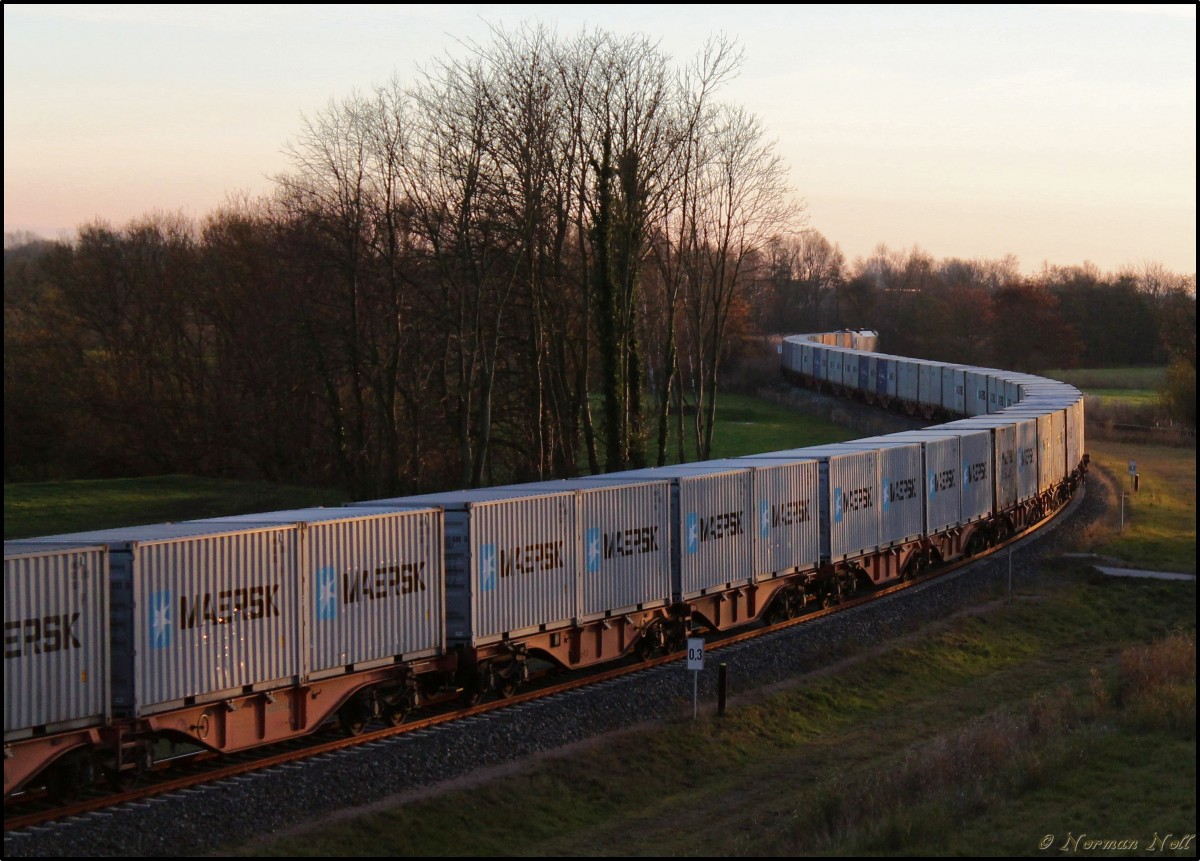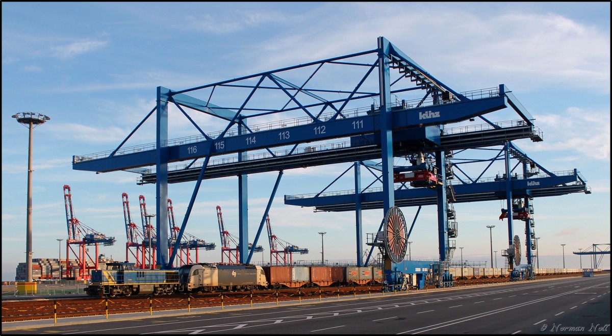 Hier schlängelt sich V 2102 der MWB und 183 705-3 der Wiener Lokalbahnen Cargo GmbH mit Ihrem Containerzug und Lichtspielen übers Wilhelmshavener Industriegleis in Richtung Sande. 23/11/2013 Norman