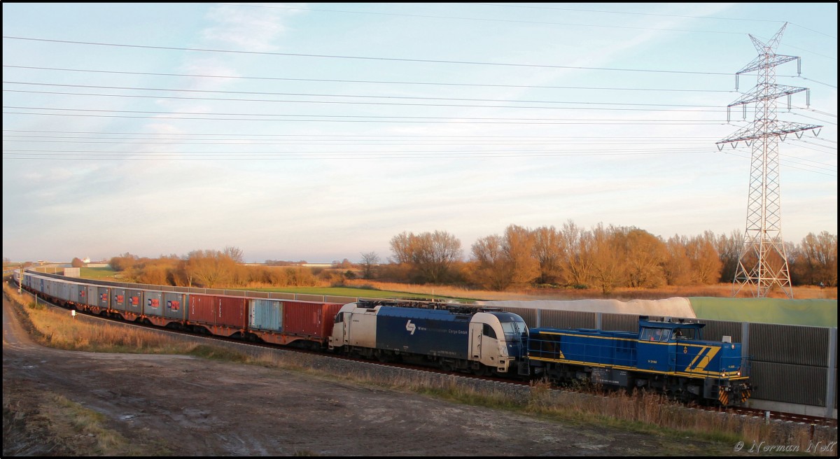 V 2102 der MWB und 183 705-3 der Wiener Lokalbahnen Cargo GmbH bei der fahrt mit Ihrem Containerzug übers Wilhelmshavener Industriestammgleis in Richtung Sande. 23/11/2013 Norman