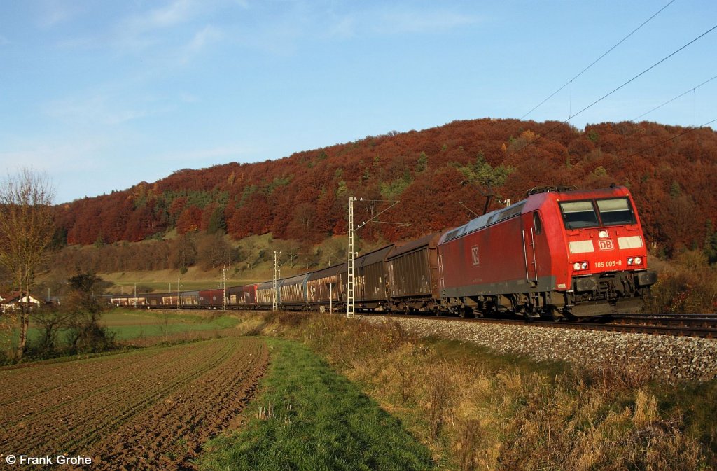 185 005-6 zieht am 03. Oktober 2013 einen gemischten Güterzug durch das Kronacher Stadtgebiet in Richtung Lichtenfels.