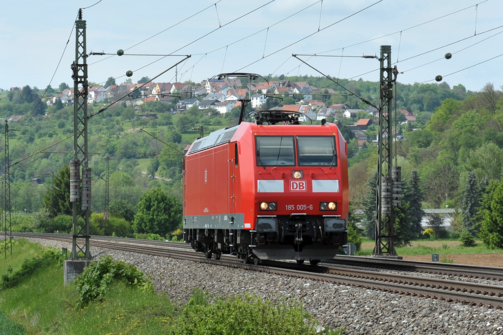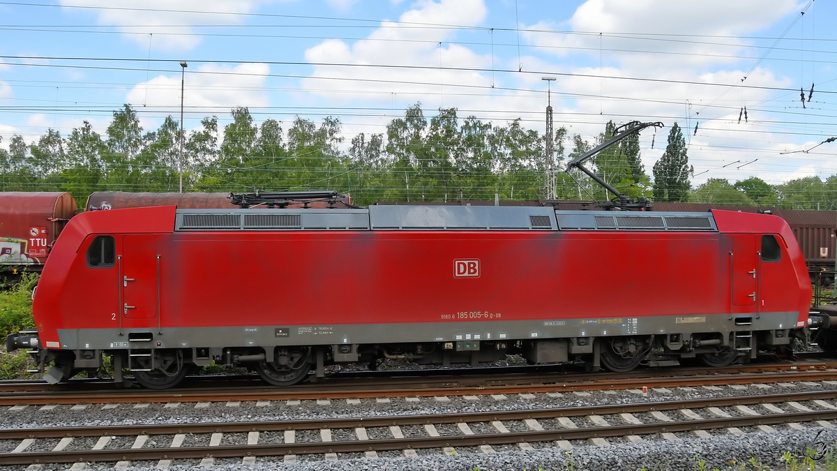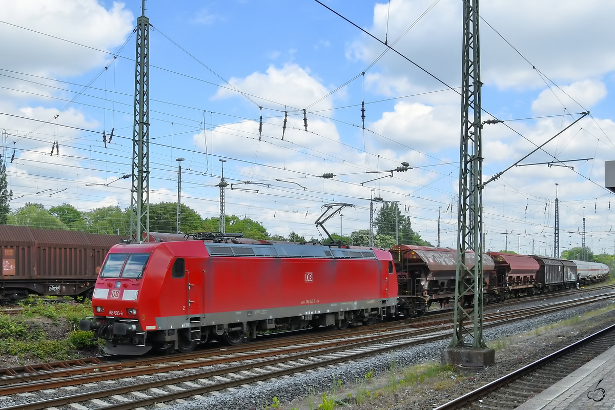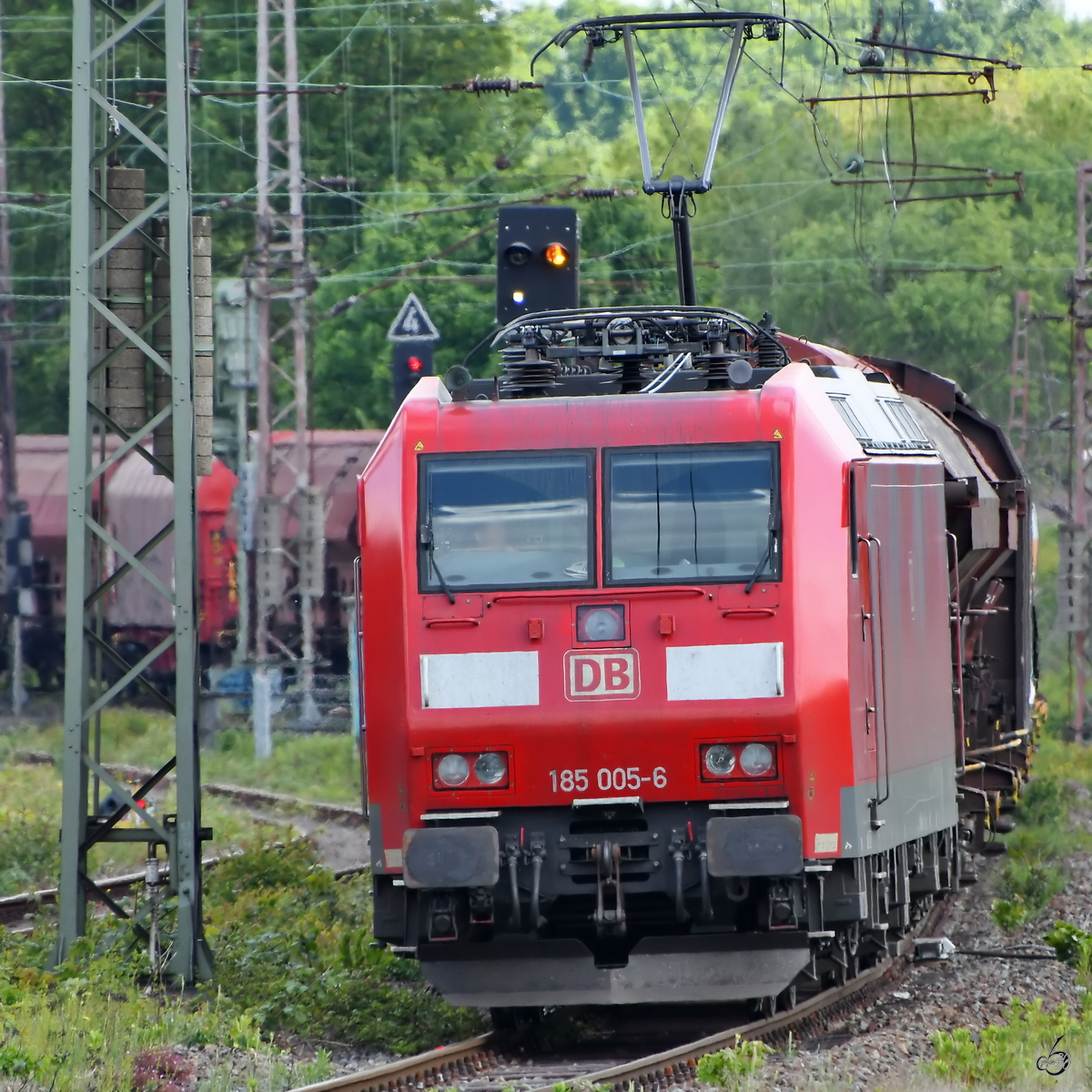 Die Elektrolokomotive 185 005-6 fuhr Mitte Mai 2020 mit einem gemischten Güterzug in Bochum-Langendreer.