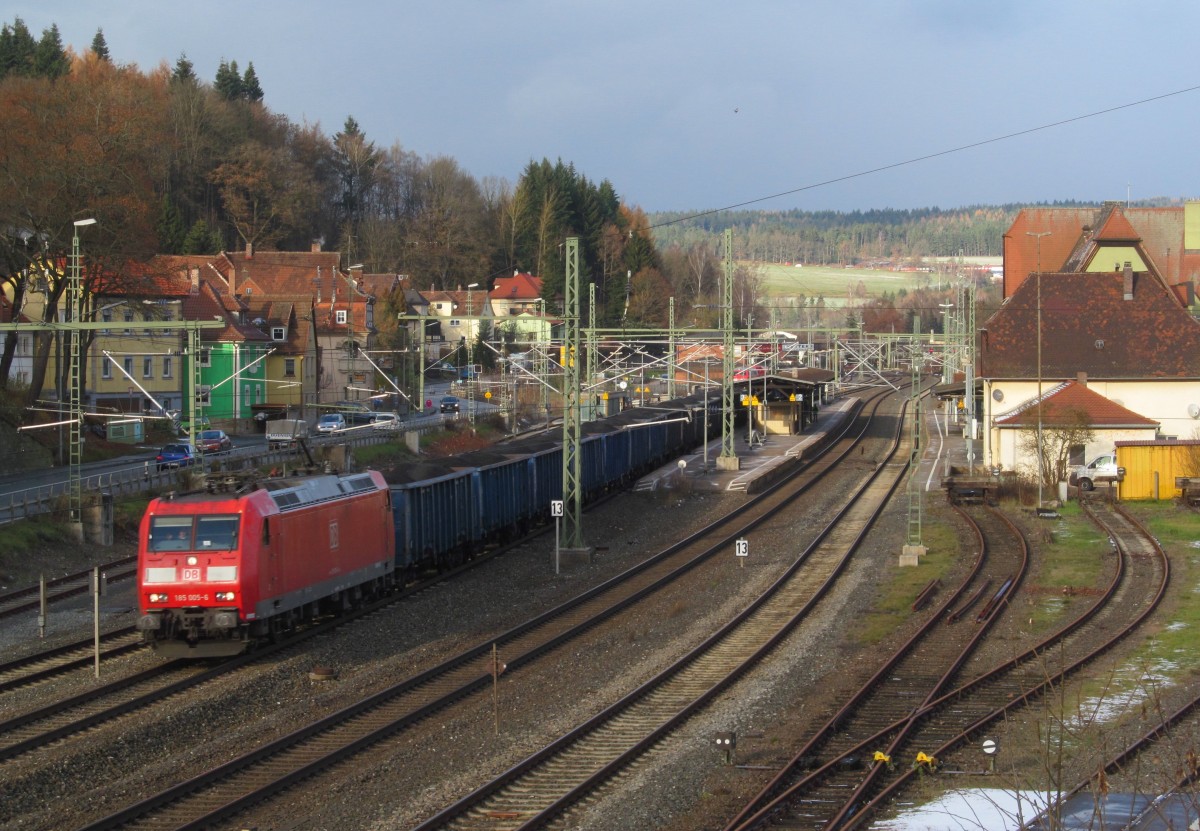 185 005-6 zieht am 26. November 2013 einige offene Güterwagen der PKP (beladen mit Kohle) durch Kronach in Richtung Lichtenfels.