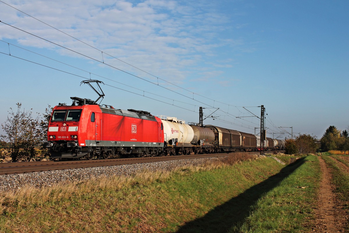 Am 31.10.2014 bespannte 185 033-8 den 44280 (Offenburg Gbf - Mulhouse Ville), als sie bei Hügelheim, nördlich von Müllheim (Baden), kurz vor der Grenze nach Frankreich war.