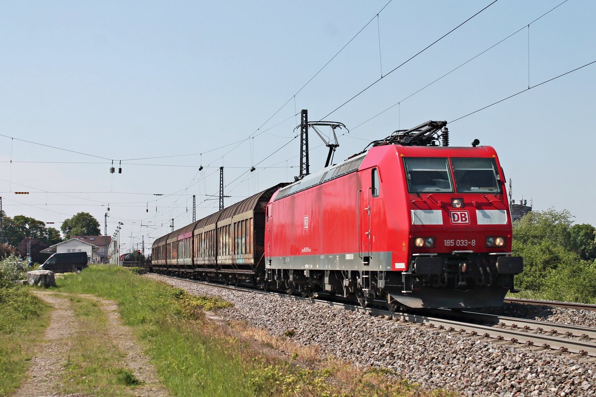Am Morgen des 25.05.2019 fuhr die 185 033-8 mit ihrem gemischten Güterzug (Basel Bad Rbf - Mannheim Rbf) durch den Bahnhof von Heitersheim über die KBS 703 in RichTung Freiburg (Breisgau).