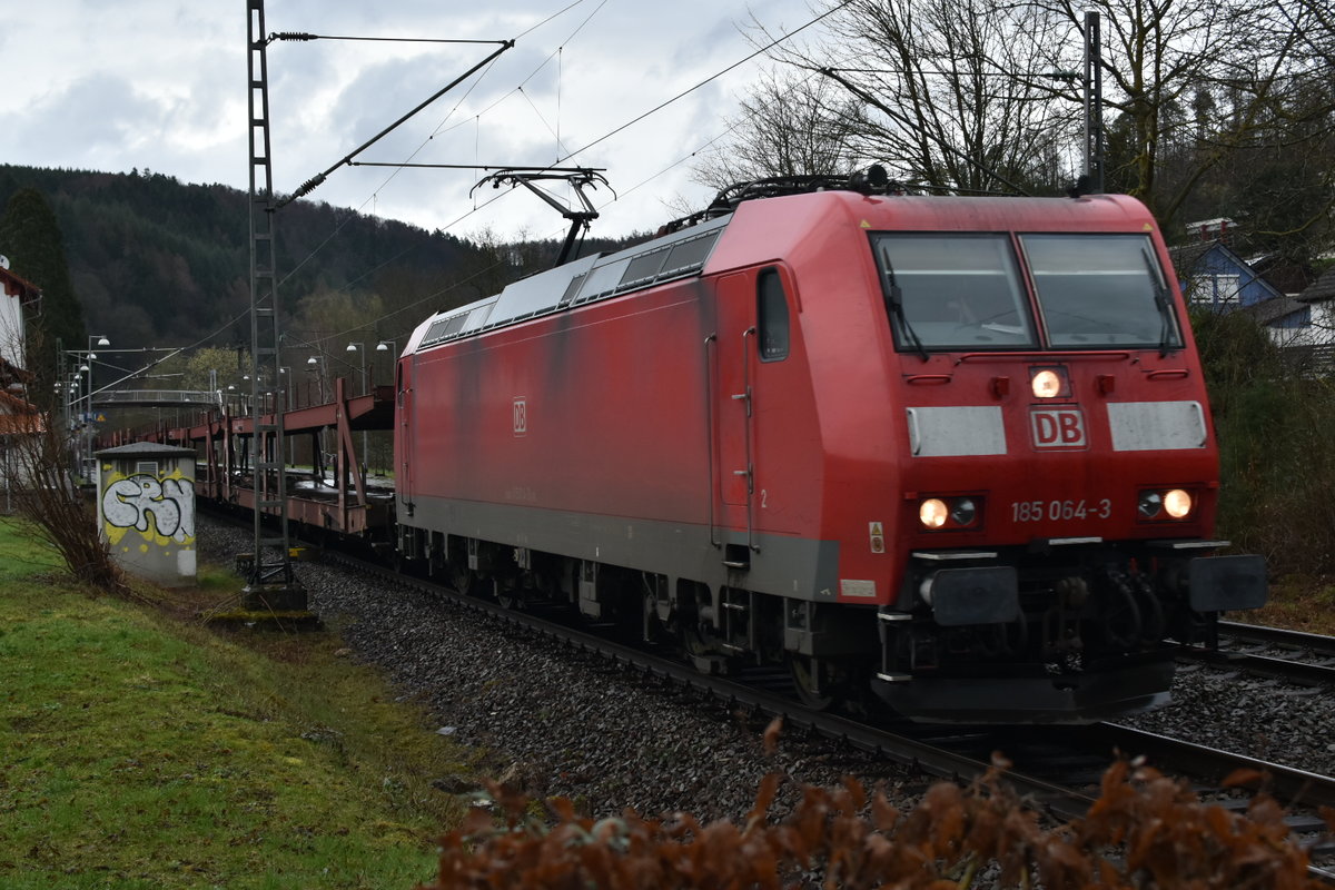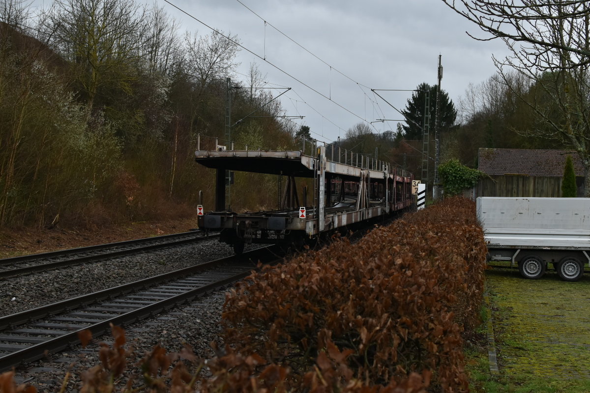 Nachschuß auf den Autotransportwagenleerzug der von der 185 064-3 am Nachmittag des 12.3.2020 Neckargerach gen Neckarelz unterwegs war. Andreas Strobel