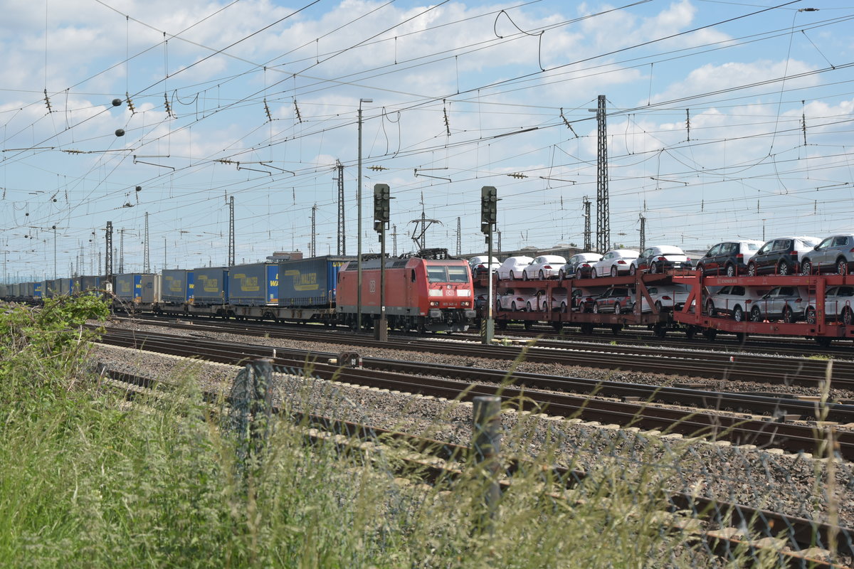 Blick über die Gütergleise in Bischofsheim, mit einem Walther Klv steht hier die 185 148-4 an Vatertag 2017.