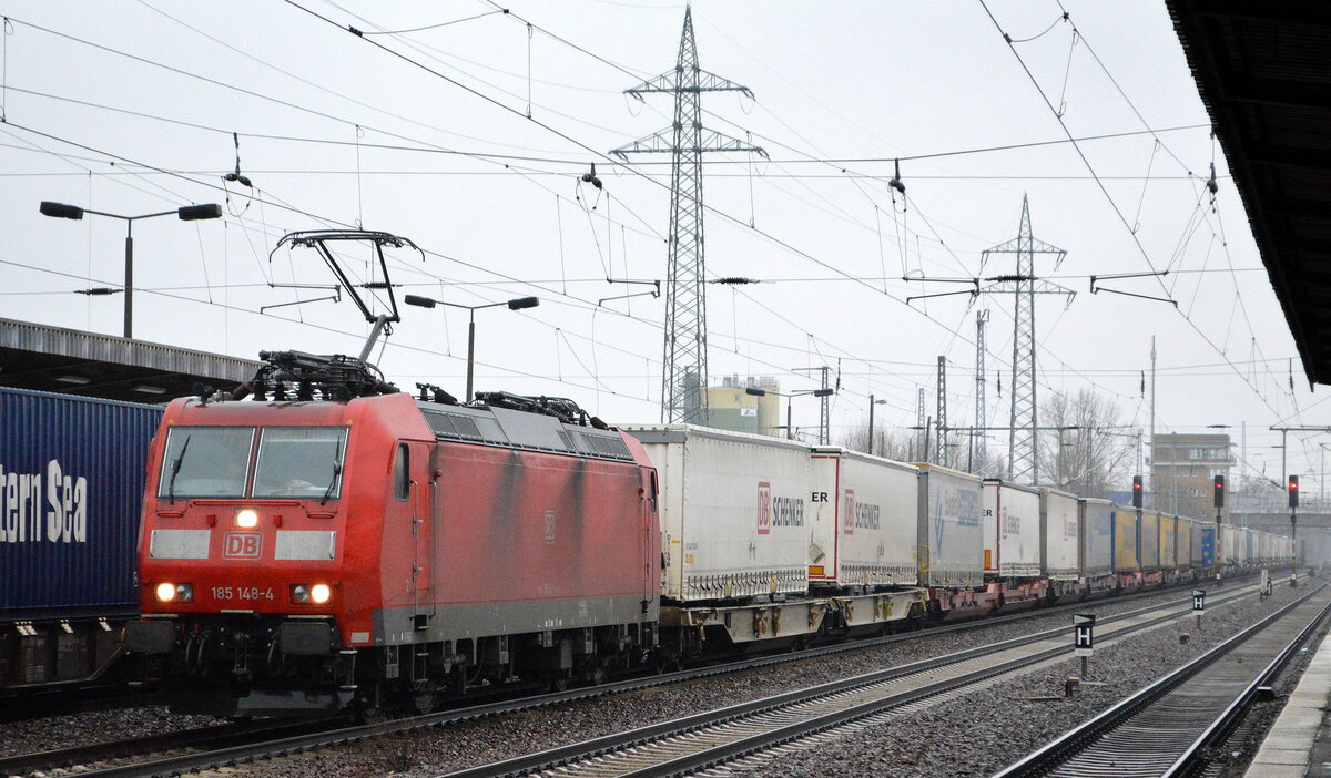 DB Cargo AG [D] mit  185 148-4  [NVR-Nummer: 91 80 6185 148-4 D-DB] und KLV-Zug aus Rostock-Seehafen am 27.01.22 bei der Durchfahrt Bf. Flughafen BER - Terminal 5.