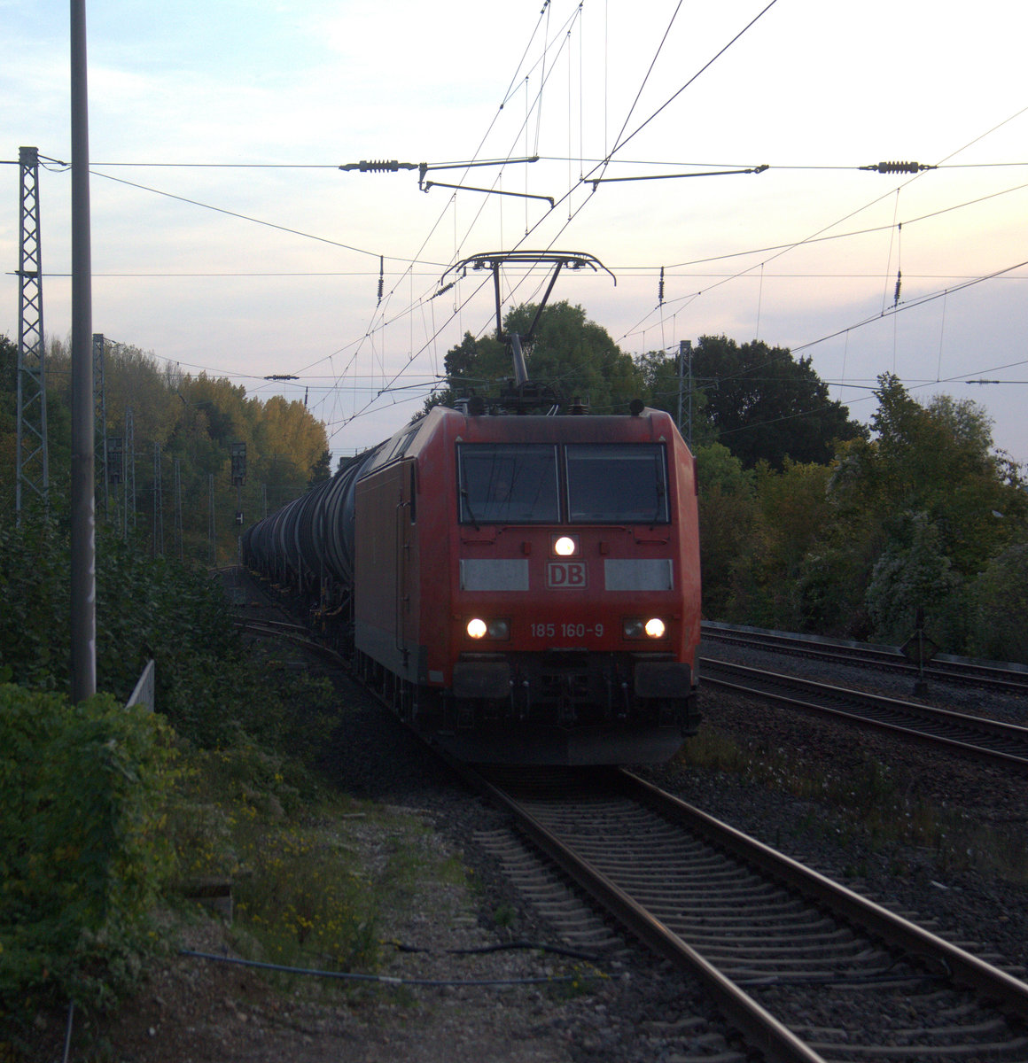 185 160-9 DB kommt als Umleiter aus Richtung Aachen-West mit einem Ölzug aus Antwerpen-Petrol(B) nach Basel(CH) und fährt durch Kohlscheid in Richtung Herzogenrath,Mönchengladach. Aufgenommen von Bahnsteig 1 in Kohlscheid. In der Abendstimmung am Abend vom 14.10.2019.