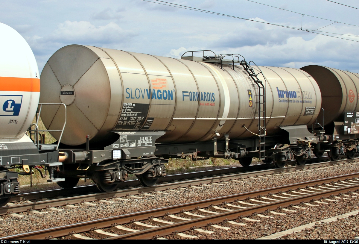Blick auf einen slowakischen Kesselwagen der Gattung "Zans" (33 56 7842 210-6 SK-SLVAG) der SLOV-VAGON, a.s., der in einem gemischten Gz mit 185 160-9 DB eingereiht ist und den Bahnhof Rodleben auf der Bahnstrecke Trebnitz–Leipzig (KBS 254) Richtung Trebnitz durchfährt. Aufgenommen von Bahnsteig 1. [10.8.2019 | 13:30 Uhr]