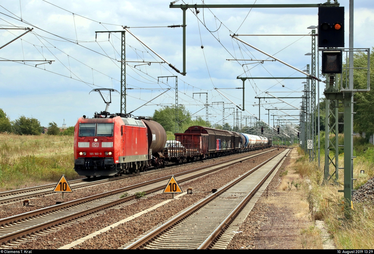 Gemischter Gz mit 185 160-9 DB durchfährt den Bahnhof Rodleben auf der Bahnstrecke Trebnitz–Leipzig (KBS 254) Richtung Trebnitz. Aufgenommen am Ende des Bahnsteigs 1. [10.8.2019 | 13:29 Uhr]