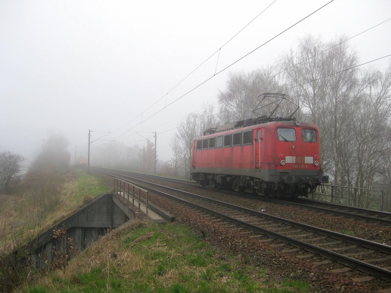140 218-9 fährt am 1.04.09 als Lz durch Hamburg-Moorburg nach Maschen Rbf um dort auf neue Aufgaben zu warten. Im Hintergrund sieht man schon die Umrisse von 185 325-8, die sich im Schritttempo Richtung Rbf Alte Süderelbe zubewegt. Lars Backhaus