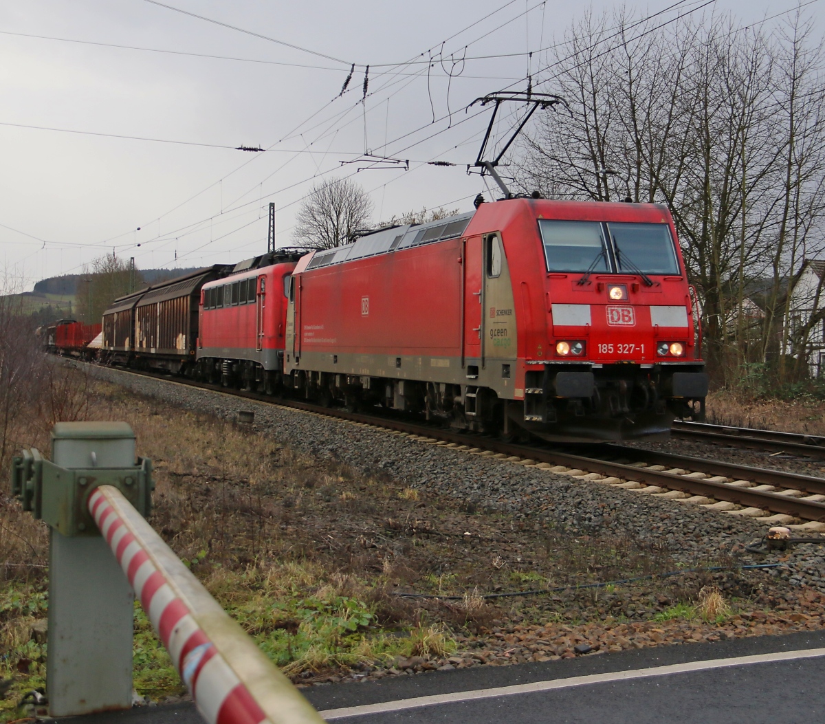 185 327-1 mit 140 805-3 als Wagenlok und gemischtem Güterzug in Fahrtrichtung Norden. Aufgenommen am BÜ zwischen Eltmannshausen und Oberhone am 10.02.2016.
