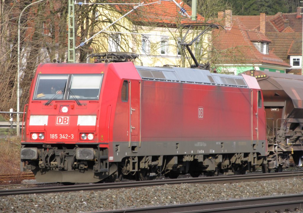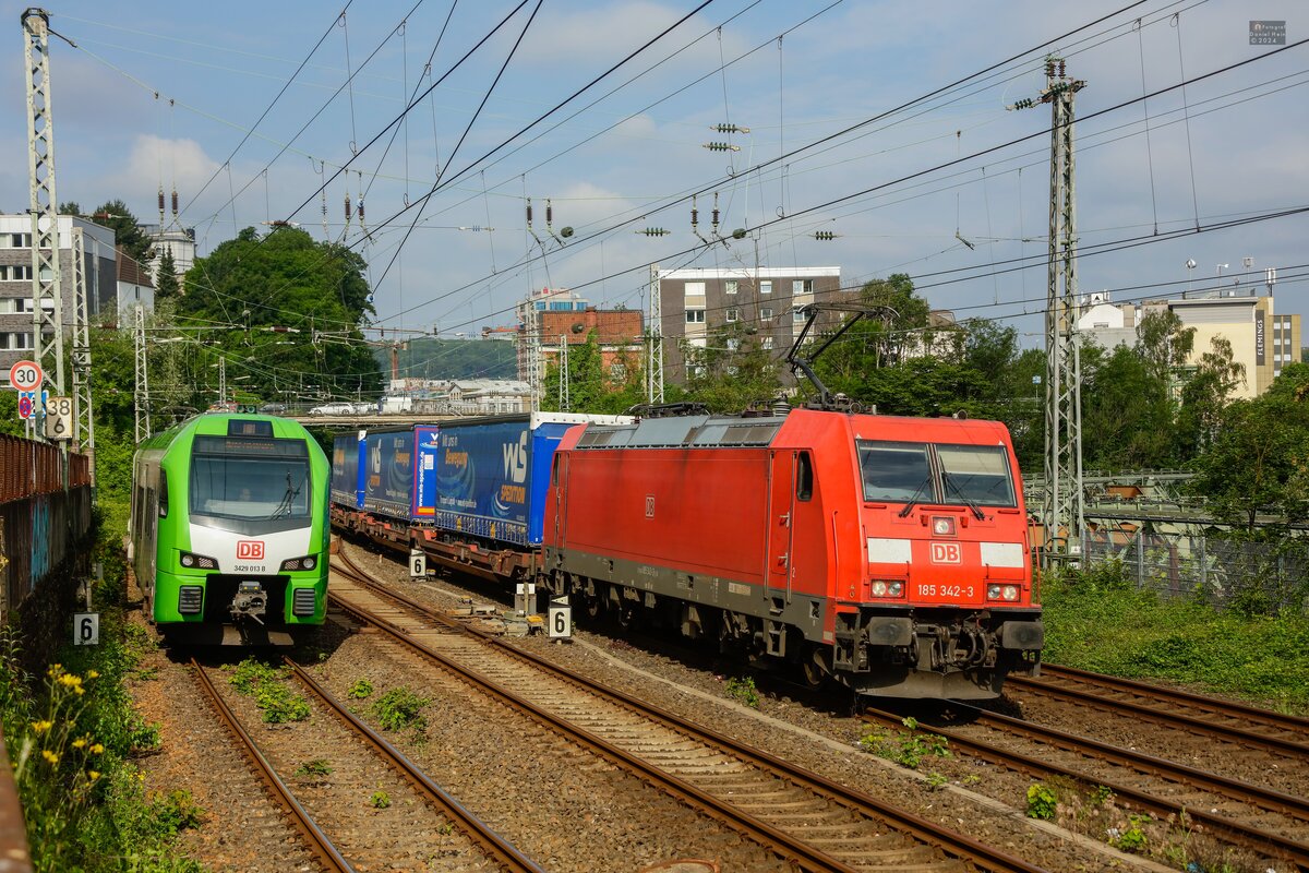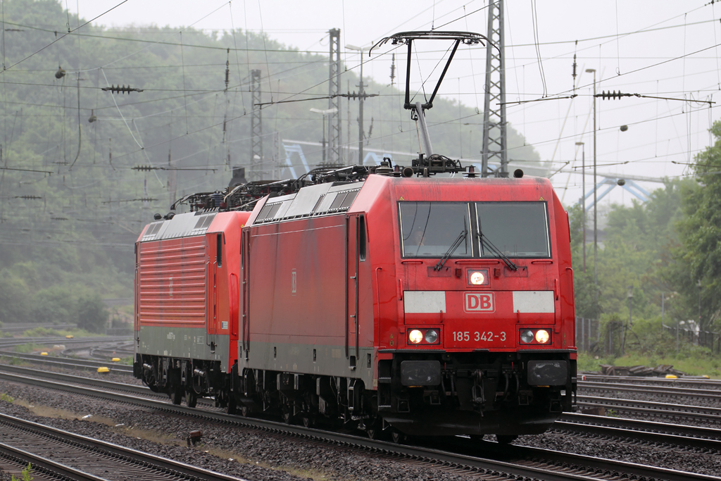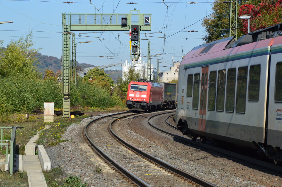 185 342-3 in Oberlahnstein und ein gegen kommender Zug.