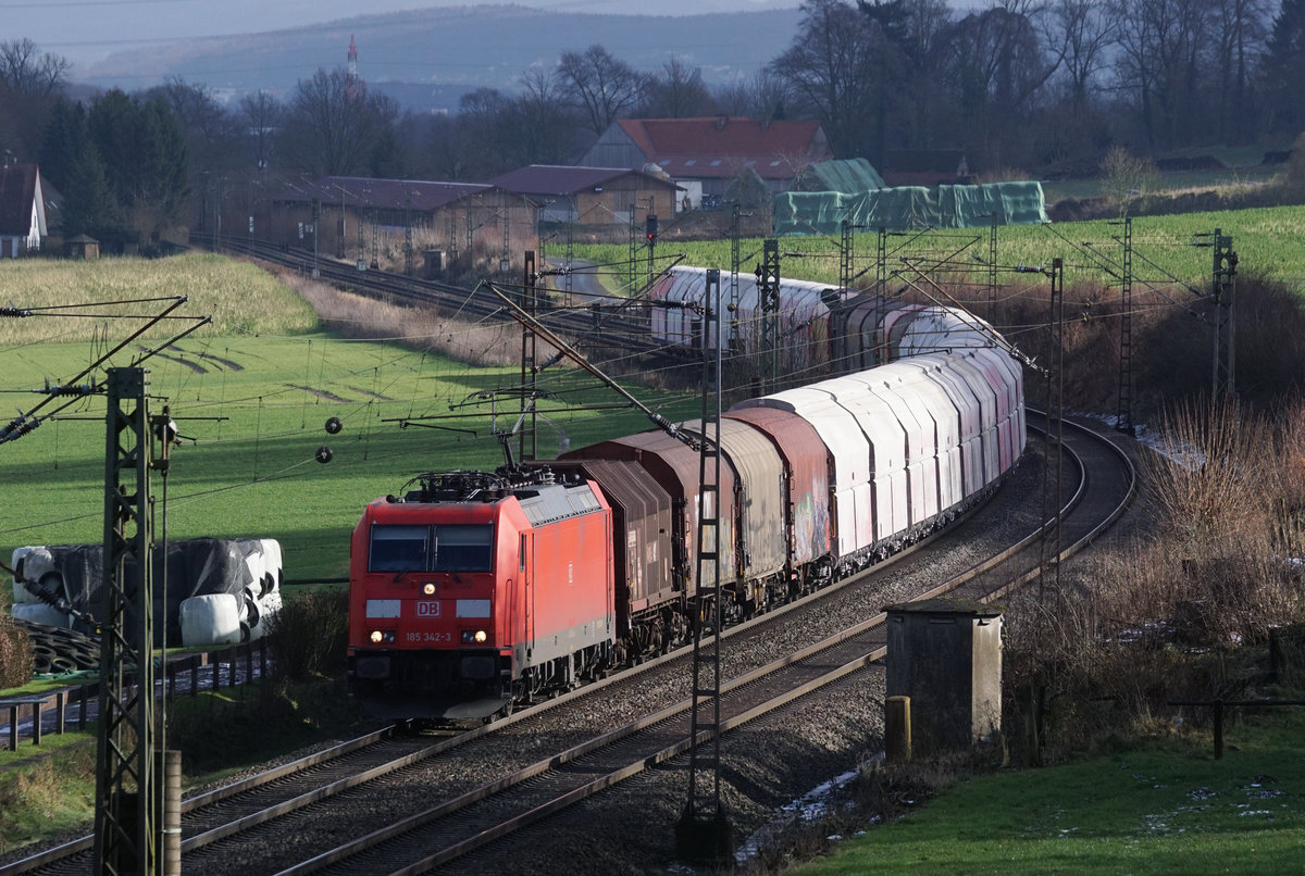 185 342-3 mit Güterzug auf dem Weg über den Wiehengebirgs-Pass in Fahrtrichtung Osnabrück bei Bohmte am 12.02.2018.