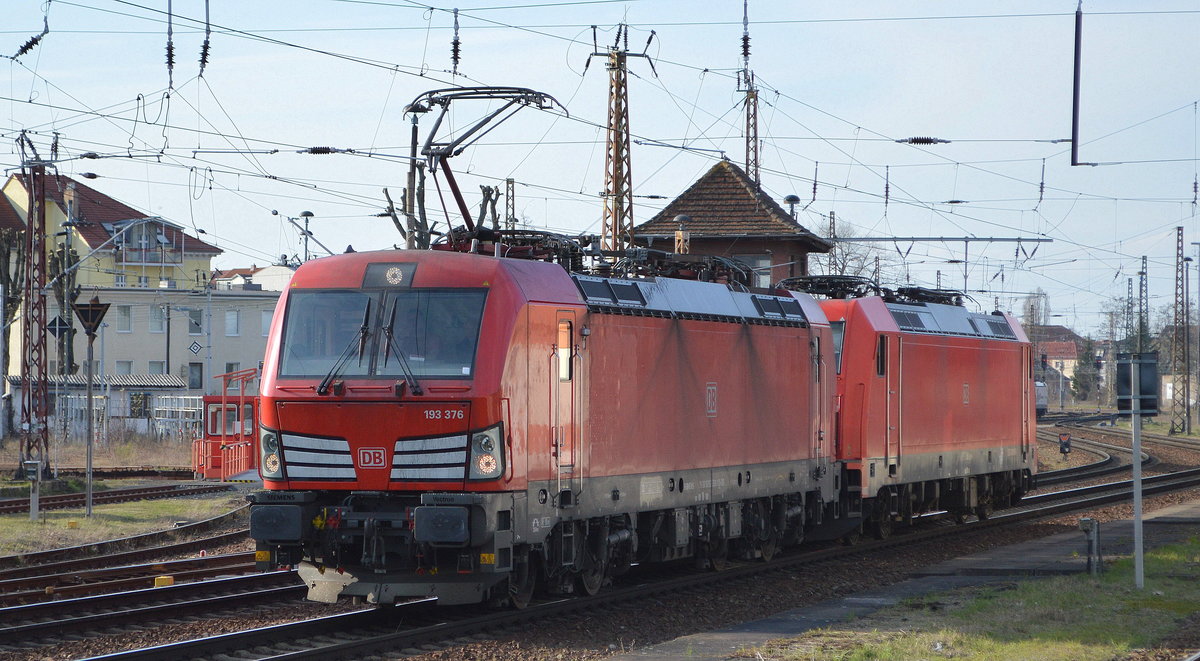 DB Cargo AG [D] mit Lokzug mit "193 376" [NVR-Nummer: 91 80 6193 376-1 D-DB] mit "185 342-3" [NVR-Nummer: 91 80 6185 342-3 D-DB] am Haken am 16.03.20 Bf. Frankfurt/Oder.