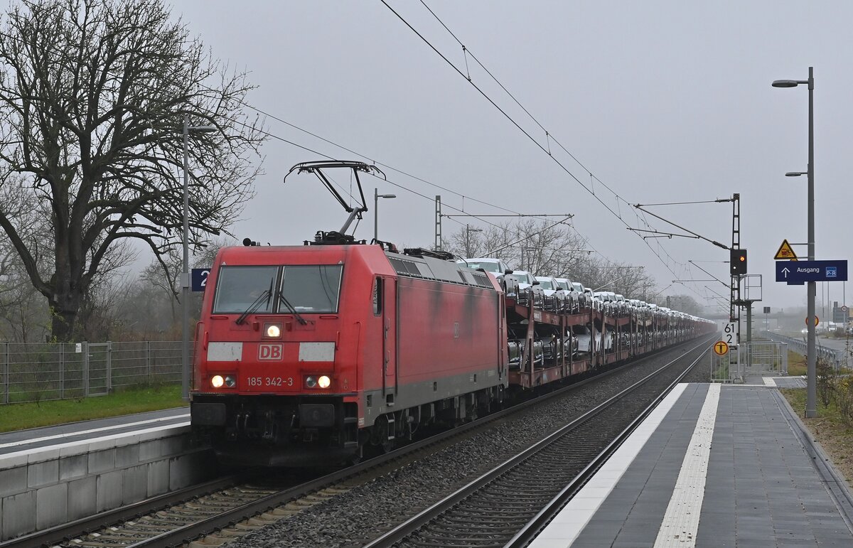 185 342-3 der DB ist am 26.11.2014 mit einem vollen Autotransportzug durch Kirchstetten unterwegs.