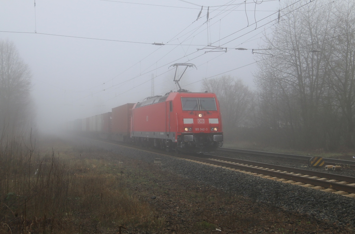 Rote Loks im Nebel: 185 342-3 mit Containerzug in Fahrtrichtung Norden. Aufgenommen am BÜ Eltmannshausen/Oberhone am 26.03.2014.
