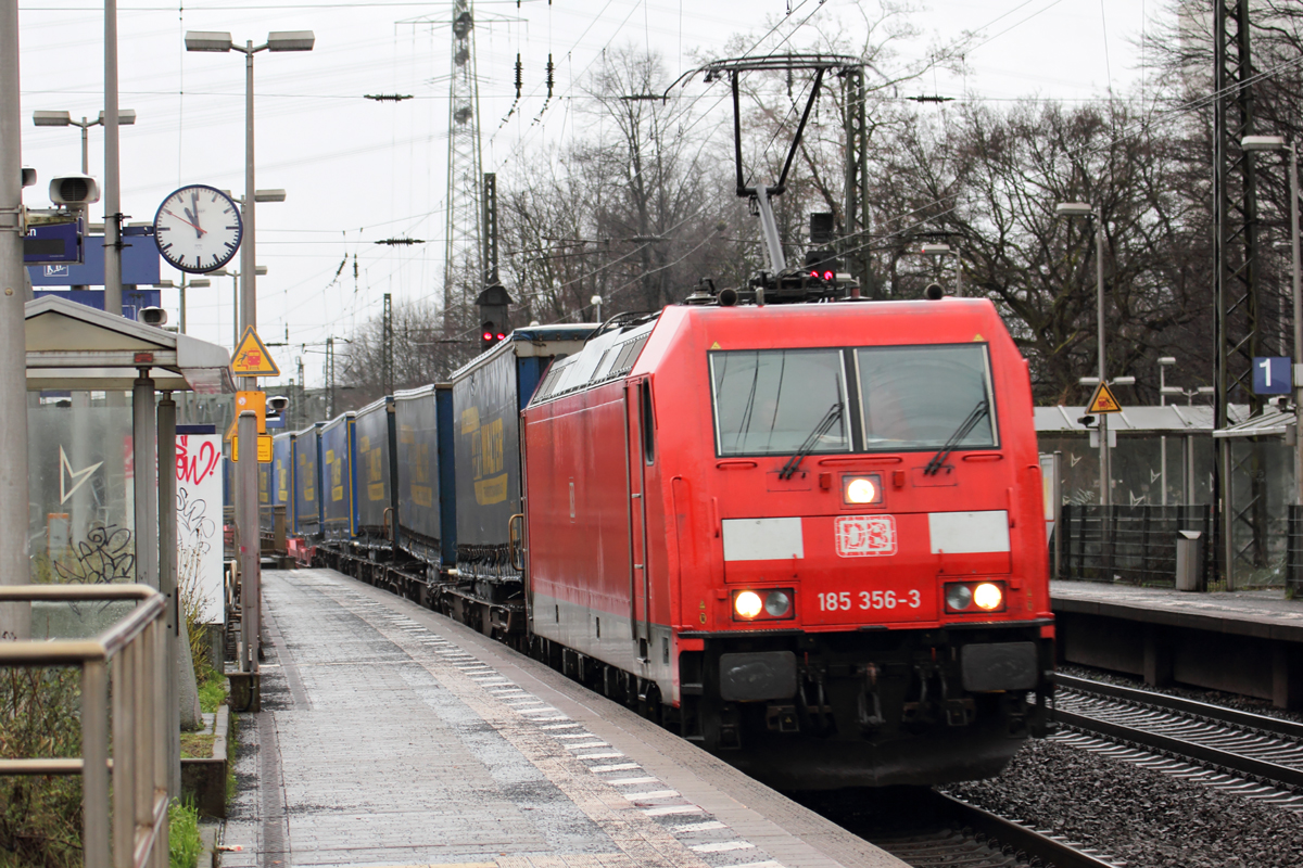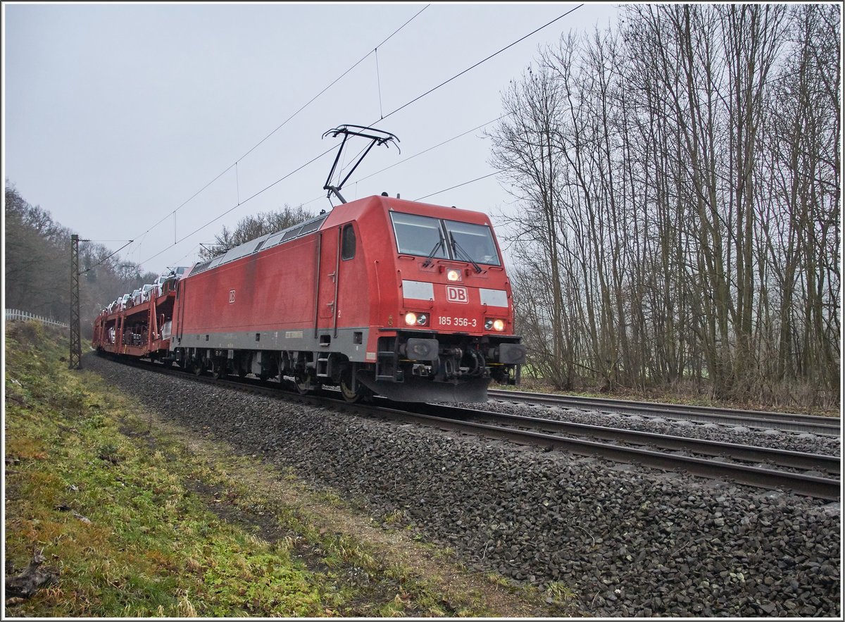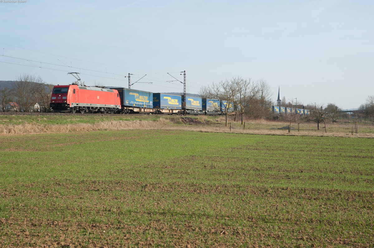 185 356-3 Richtung Norden mit einen Aufliegerzug bei Thüngersheim anm 11.03.14.