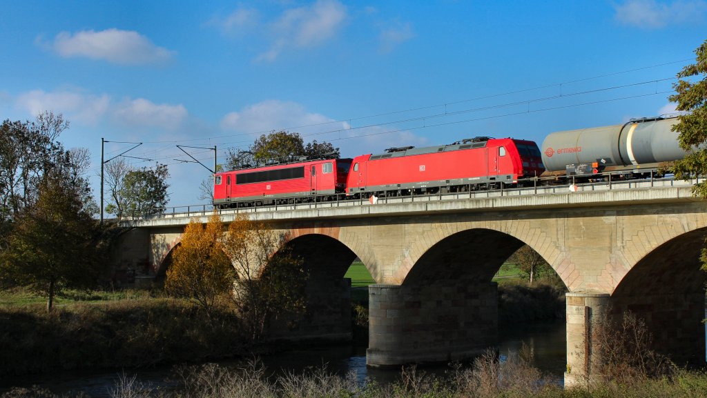 155 080-3 und die faule 185 371-2 vor einem Kesselwagenzug auf der Saalebrücke kurz vor Naumburg (Saale) aus Richtung Weißenfels kommend; 03.11.11