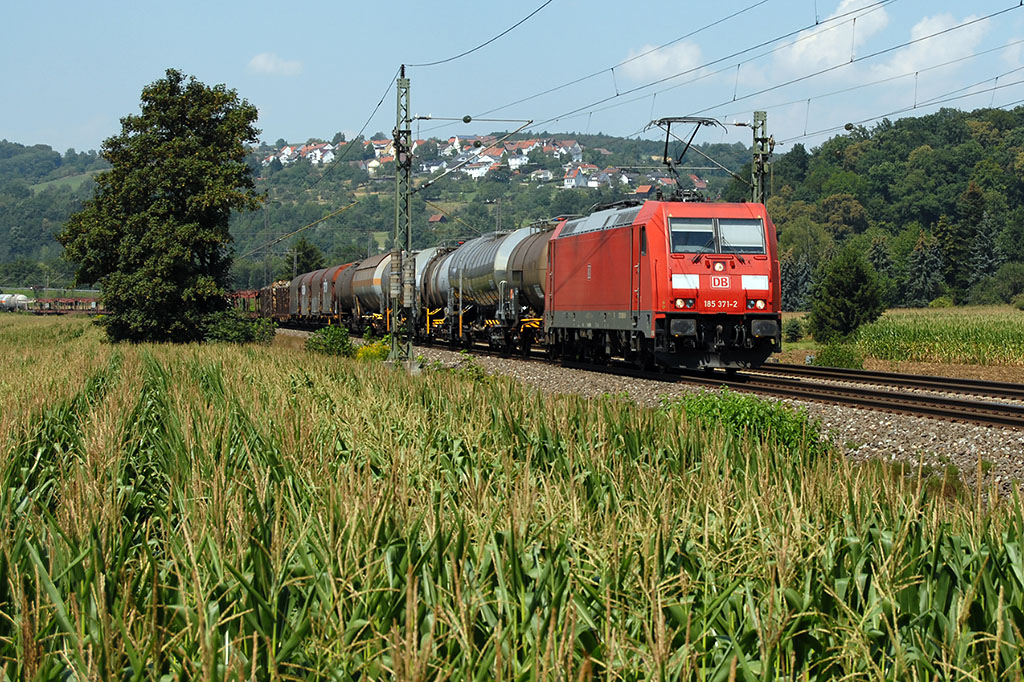 185 371-2 mit IKL 50510 Singen(Htw) - Rheinhausen nördlich von Singen(Htw). 23.06.10