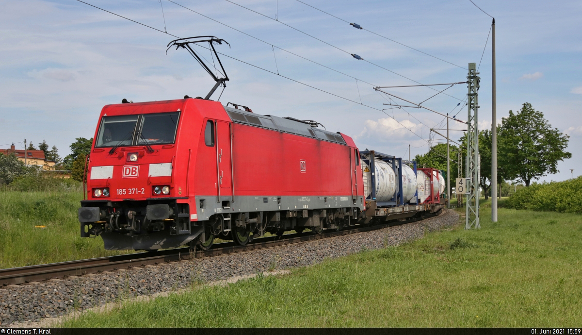 DB Cargo AG, Mainz mit ihrer  185 371-2  [NVR-Nummer: 91 80 6185 371-2 D-DB] mit einem Kesselwagenzug möglicherweise zur Abstellung Bahnhof Brandenburg-Altstadt am 15.05.24 Höhe Bahnhof Saarmund.