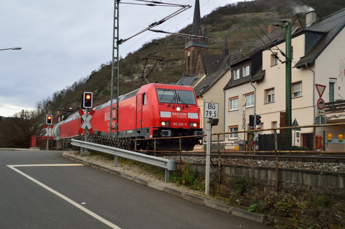 Durch Lorchhausen fahren die 185 299-5 und die 185 371-2 mit einem ewig langen Tankwagenzug gen Süden. 20.2.2014