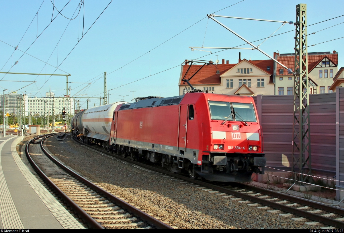 Gemischter Gz mit 185 394-4 DB passiert den Interimsbahnsteig Halle(Saale)Hbf Gl. 13a auf der Ostumfahrung für den Güterverkehr in südlicher Richtung. (verbesserte Version) [1.8.2019 | 8:23 Uhr]