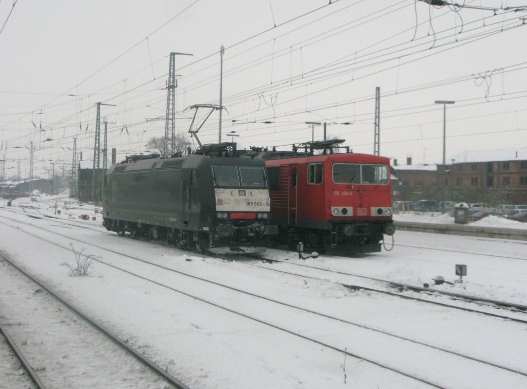 Hier links 185 533-5 und rechts 155 230-6, diese beiden Loks standen am 14.1.2010 in Angermünde.