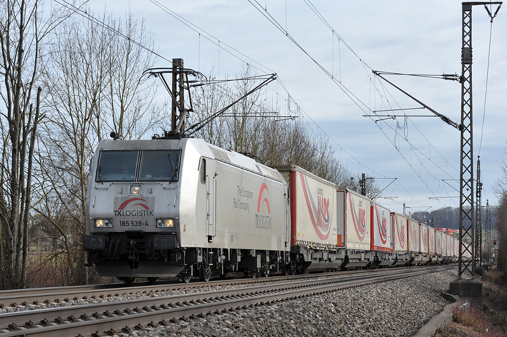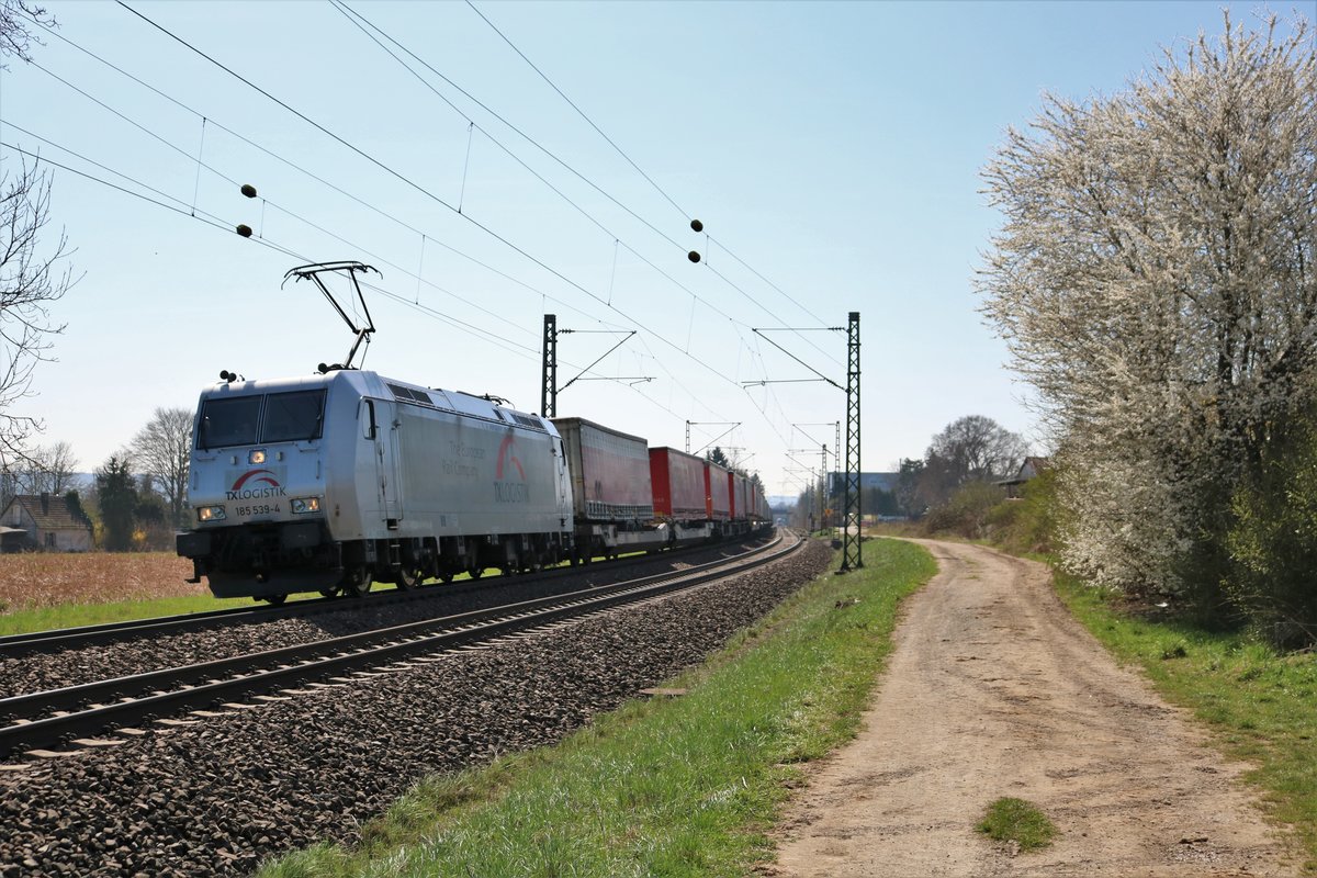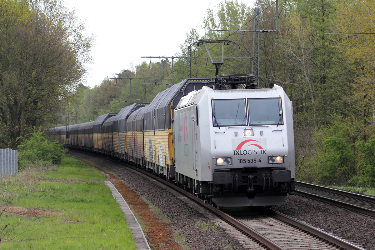 185 539-4 der TX Logistik mit einem Altmannzug bei Erzhausen am 13.04.2017