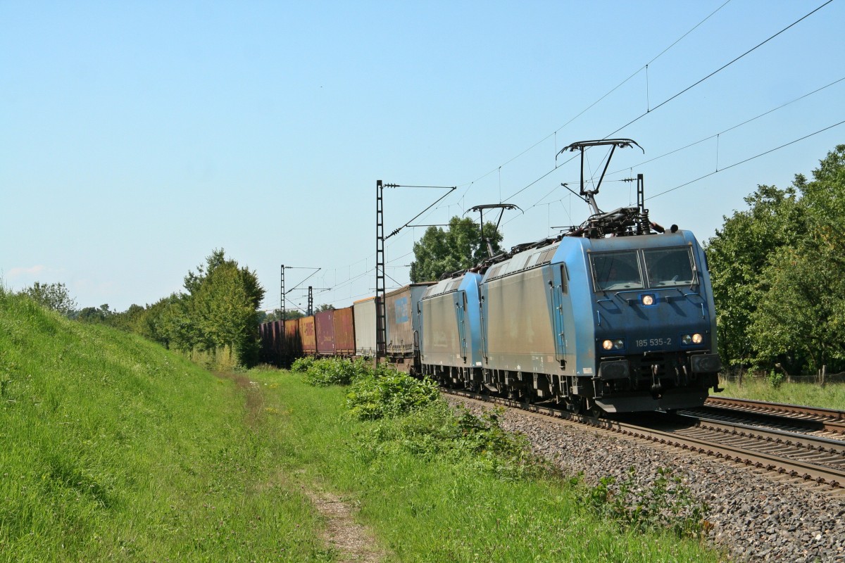 185 535-2 zusammen mit 185 563-0 und dem 49695 in Richtung der Schweiz am Nachmittag des 01.08.14 nördlich von Kollmarsreute.