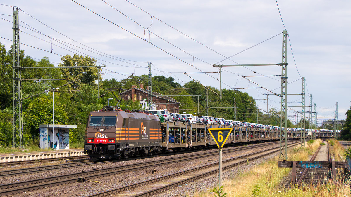 Nachschuss auf 185 602-0, die am Schluss eines Autotransportzugs (BLG Logistics Group AG & Co. KG) mit 185 599-8 angehängt ist und in Teutschenthal, Alte Ziegelei, Richtung Sangerhausen fährt. 🧰 Beacon Rail Leasing Limited (BRLL), vermietet an die HSL Logistik GmbH (HSL) 🚩 Bahnstrecke Halle–Hann. Münden (KBS 590) 🕓 6.9.2020 | 16:37 Uhr