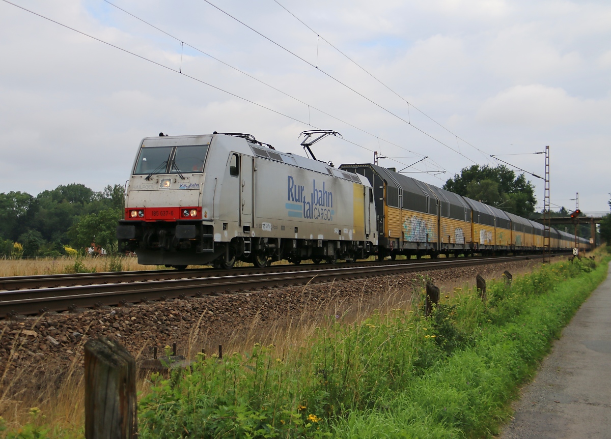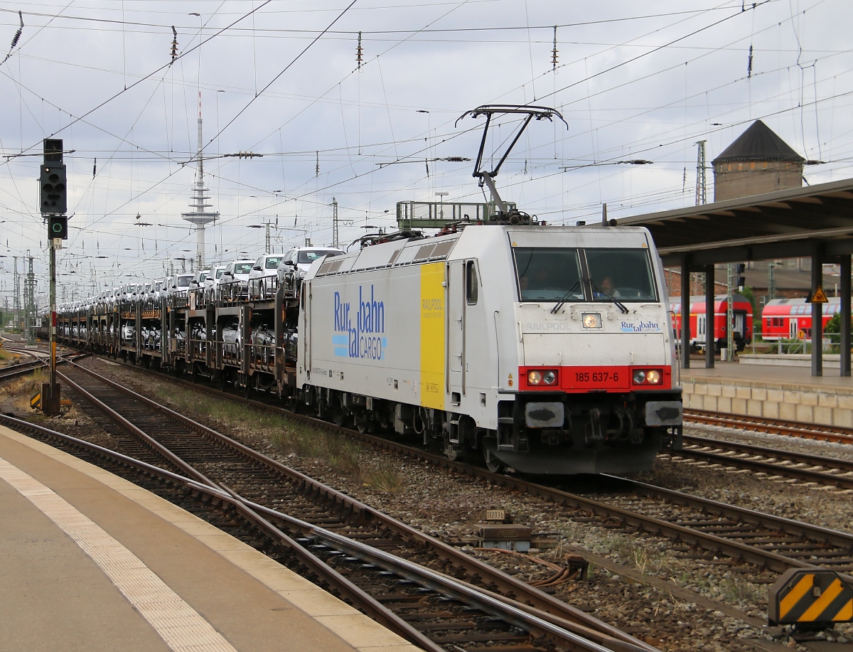185 637-6 von  der Rurtalbahn-Cargo kommt mit einem langen Autozug aus Norden und hält in Würzburg-Hbf an und fährt weiter in Richtung Nürnberg.