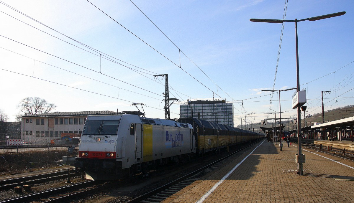 185 637-6 von der Rurtalbahn-Cargo kommt mit einem langen Autozug aus Norden und hält in Würzburg-Hbf an und fährt weiter in Richtung Nürnberg. Aufgenommen in Würzburg-Hbf bei schönem Sonnenschein am Nachmittag vom 20.2.2015.
