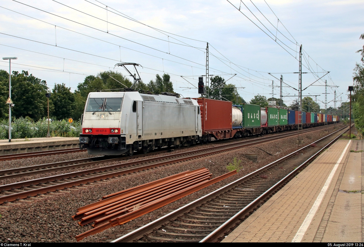 Containerzug mit 185 637-6 der Macquarie European Rail Ltd, vermietet an die ITL Eisenbahngesellschaft mbH (ITL), durchfährt den Bahnhof Schwarzenbek auf der Bahnstrecke Berlin–Hamburg (KBS 100) Richtung Hamburg. [5.8.2019 | 13:26 Uhr]