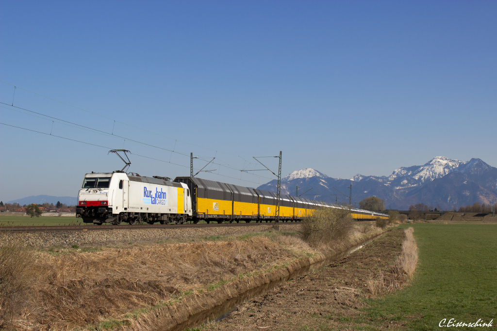 185 637-6 mit einem Ganzzug neuer, geschlossener ARS-Autotransportwagen in Richtung Süden. Aufgenommen am 17.04.2014 in Eichenberg.