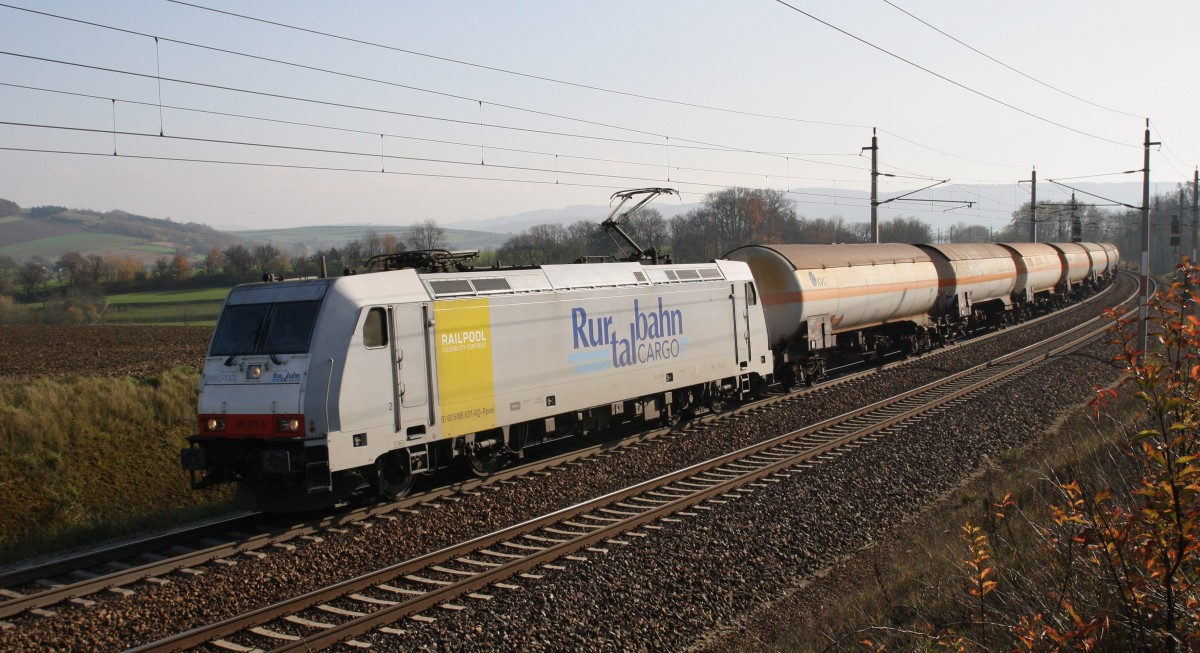 Hier kommt bei Böheimkirchen auf der Westbahn am Vormittag des 14.11.2014 die 185 637-6 der Rurtalbahn Cargo mit einem Kesselzug vorbei. Beladen ist der Zug mit Kohlenwasserstoffgas, verflüssigt.