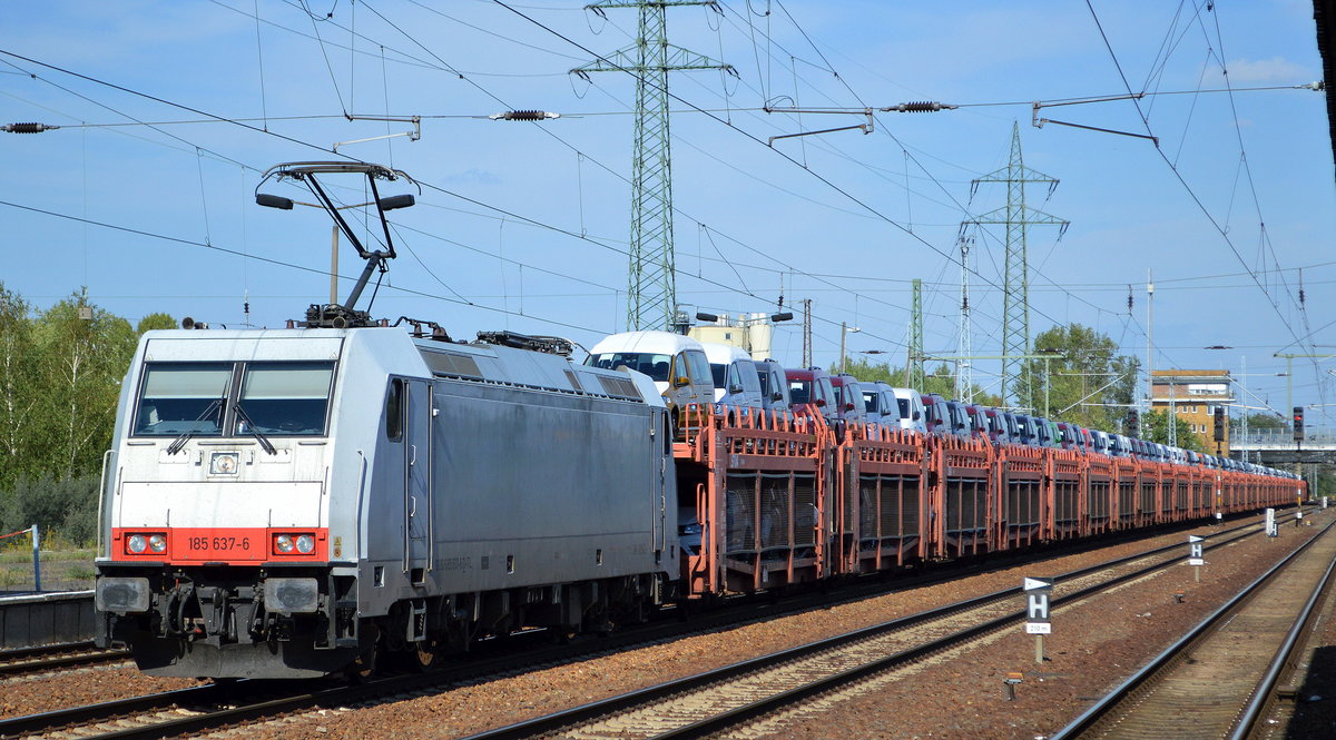ITL - Eisenbahngesellschaft mbH, Dresden [D] mit "185 637-6" [NVR-Nummer: 91 80 6185 637-6 D-ITL] und PKW-Transportzug (fabrikneue VW Nutzfahrzeuge aus polnischer Produktion) am 04.09.19 Bahnhof Flughafen Berlin Schönefeld.