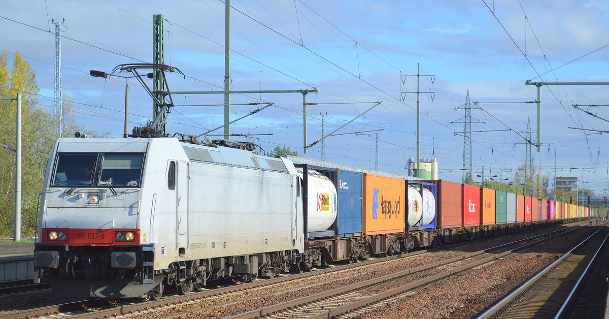 ITL - Eisenbahngesellschaft mbH, Dresden [D] mit   185 637-6  [NVR-Nummer: 91 80 6185 637-6 D-ITL] mit Containerzug am 18.10.19Durchfahrt Bf. Flughafen Berlin Schönefeld.