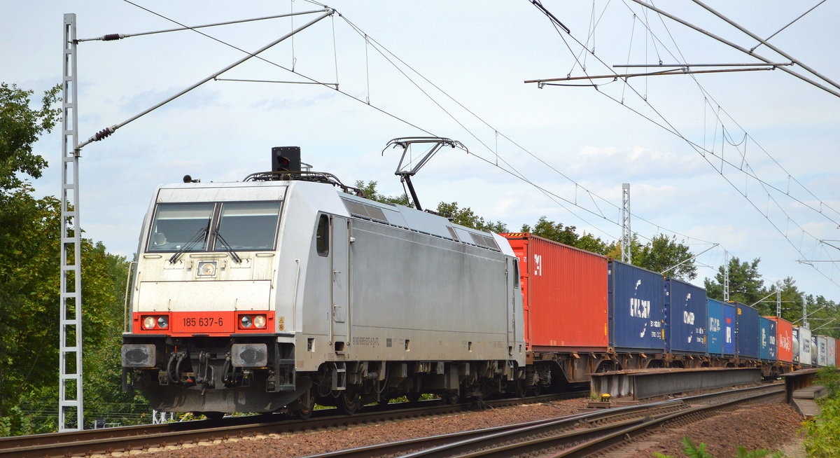 Containerzug mit 185 637-6 der Macquarie European Rail Ltd, vermietet an die ITL Eisenbahngesellschaft mbH (ITL), durchfährt den Bahnhof Schwarzenbek auf der Bahnstrecke Berlin–Hamburg (KBS 100) Richtung Hamburg.